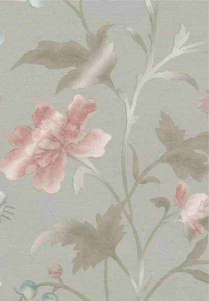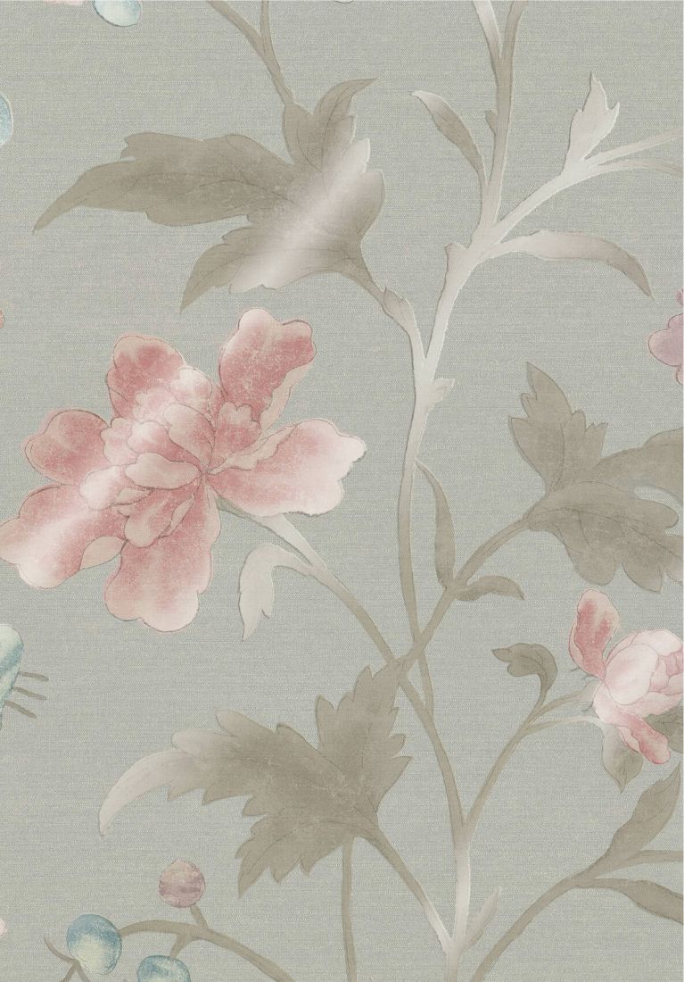 China Rose (c1885) is a classic flamboyant floral, taken from a late 19th Century French hand-painted ‘Peking Stripe’ fabric with a distinct Chinese influence. The distressed opaque colours in the leaves and petals portray the hand of the original artist, in contrast with a judicious modern-day use of mica and metallic inks as witnessed in some colourways.
