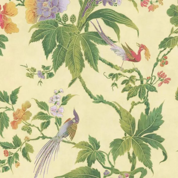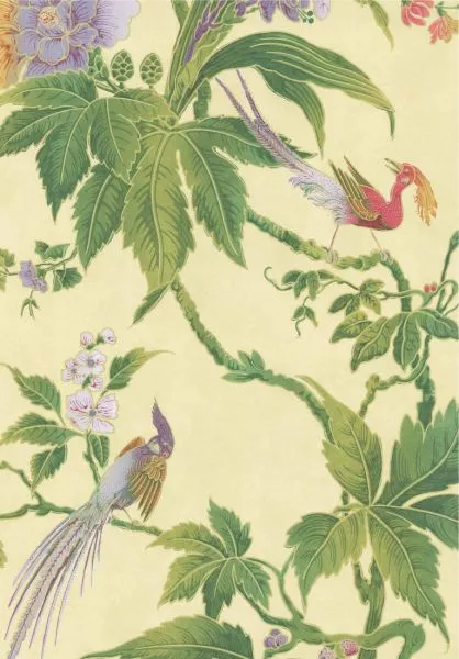Paradise (c1940) celebrates a truly rich mix of styles. The document from which this paper is drawn is actually a 20th Century piece, but the subject – exotic flora and the familiar oriental ho-ho birds - is classic ancient Chinoiserie, whilst the colouration in the original is very much in the style of a 19th Century French paper. This design retains the original’s oversized repeat and has been reproduced in six stunning colourways.