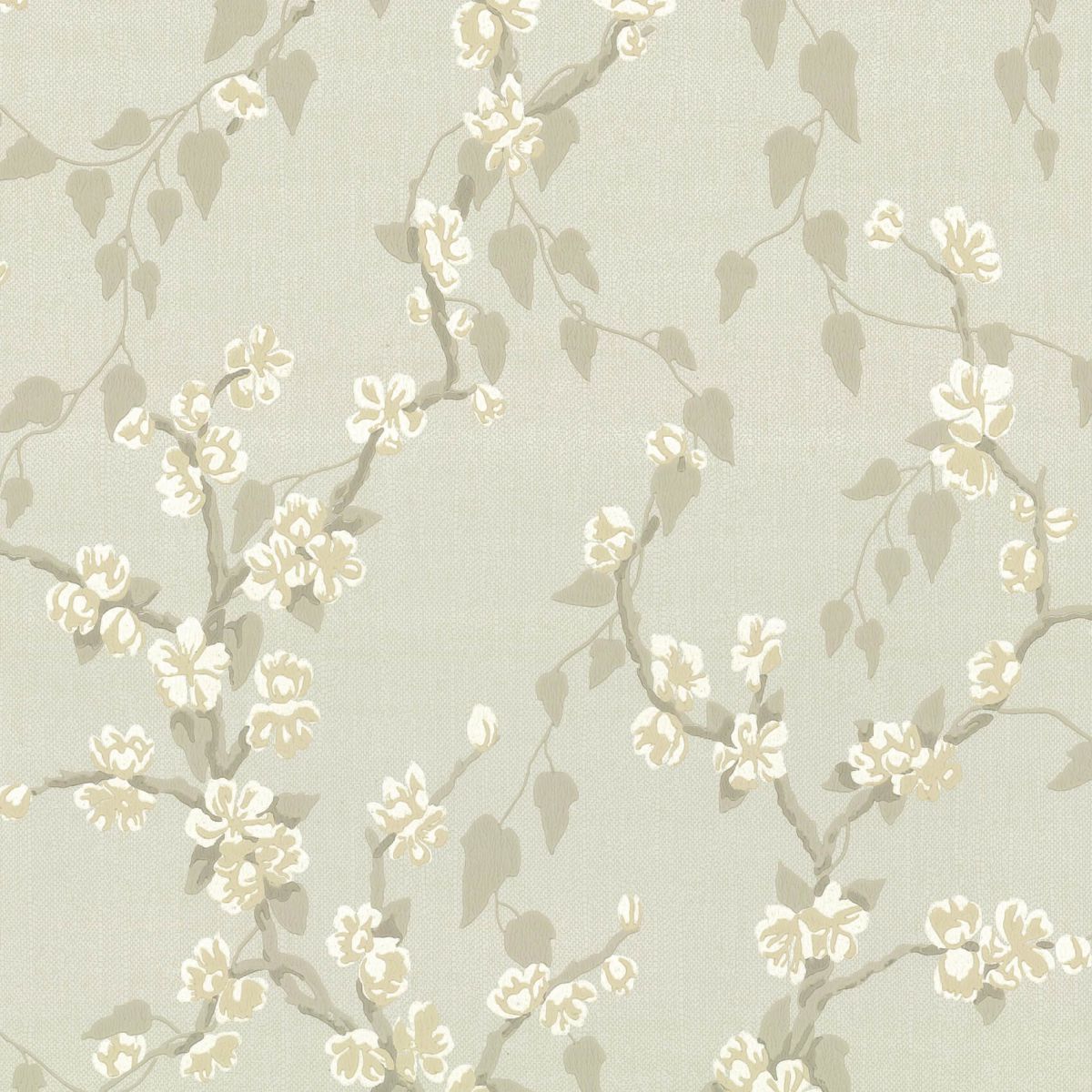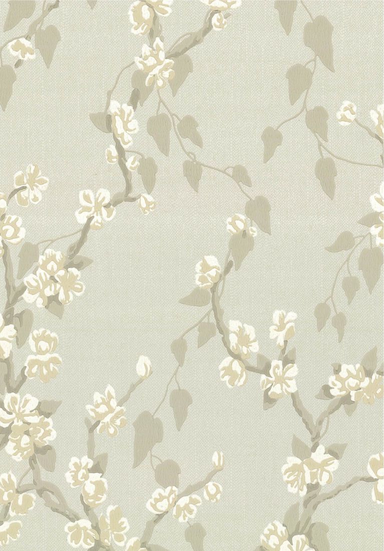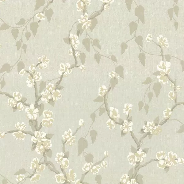 Sakura (c1936) is a pretty trail of matt leaves and delicate blossom originating in France. The surface detail has been retained, contributing to its charming layered depth, whilst the colouration has retained an elegant, seductive informality. A mica ground has been used on some colourways to exaggerate the interplay of light and contrast on the surface of the paper.