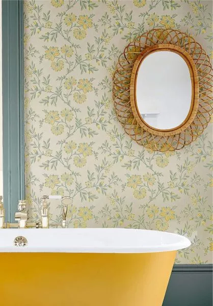 Stitch (c1940) is inspired by embroidered chintz cottons. The use of stippling (dot-work) was popular in embroidery and printing, particularly at a time when block printing was seen as an indication of status. In the late 19th and well into the 20th Century, ornate patterns in the home were a conspicuous symbol of wealth and associated with prosperity. The use of two print colours makes this paper especially easy to coordinate with paint colours and other elements in the room.