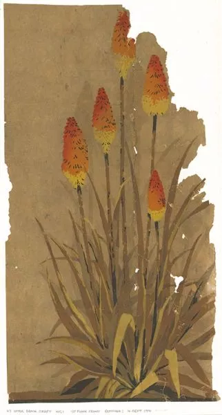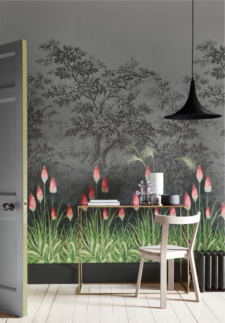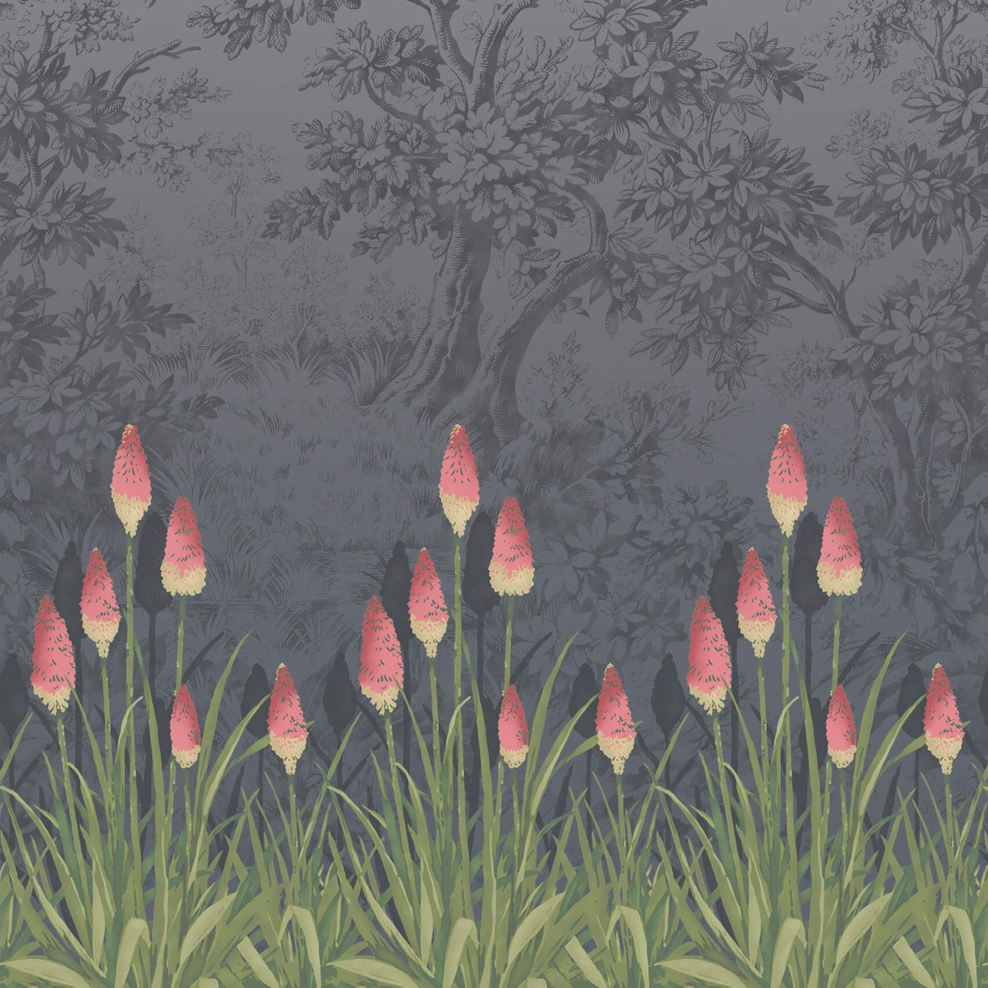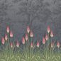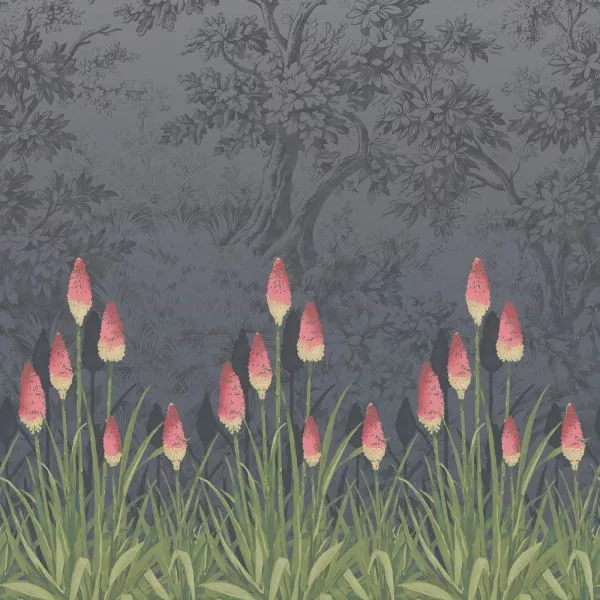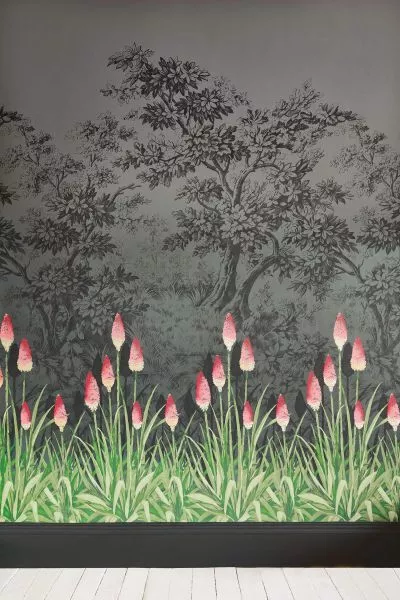 The design features brightly coloured kniphofia flowers, commonly known as torch lilies or red hot pokers (African in origin but named after German horticulturalist Johan Hieronymous Kniphof). They were recorded by English Heritage as having been hand-painted and stuck over a pre-hung wall covering in a late-18th century Upper Brook Street house as a bespoke decoration. To replicate a natural scene behind the pokers Little Greene has adapted a motif from its Stag Toile paper.