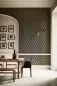 The property from which this design hails was built in the mid-19th century on the site of the infamous Marshalsea Prison, which for nearly 500 years was notorious for the incarceration of London’s debtors, including Charles Dickens’ father in 1824. The earliest paper retrieved from a laminate of four, this gothic trellis design with Moorish influences was the first paper to adorn the walls of one of the properties that replaced the prison in the late 1870s.