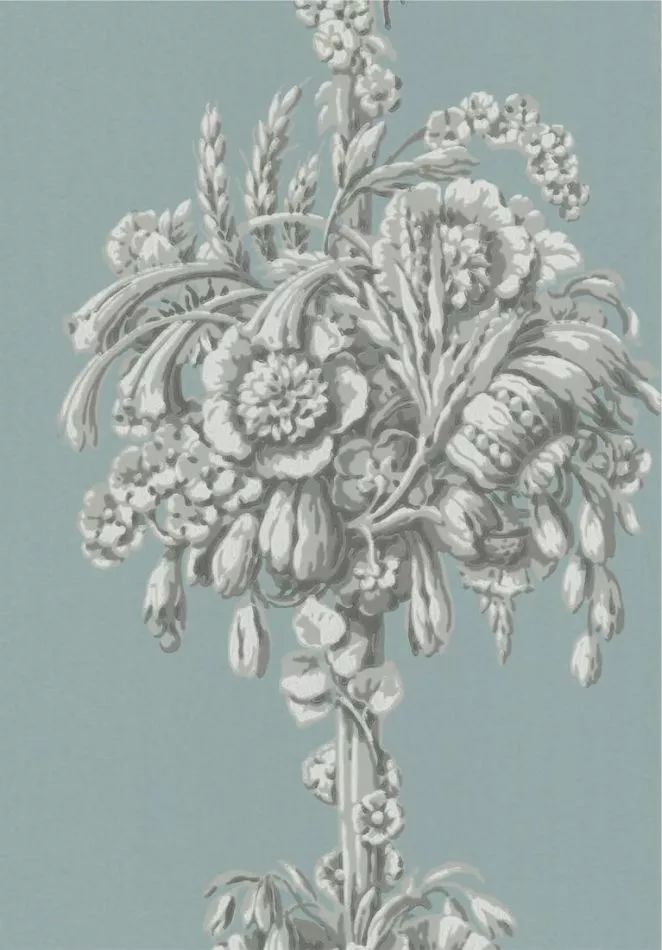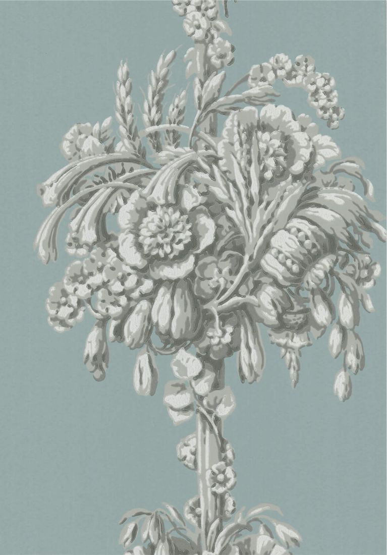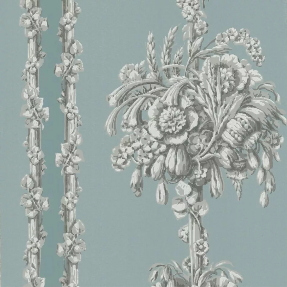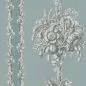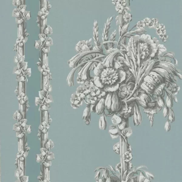This pattern is unmistakably French in style, but the archive document, which has given the new design plenty of design options, comes from a prestigious address near the Thames. The decorative stripe on either side of the flower pillar has been retained but reduced to give the pattern more balance when applied repeatedly.