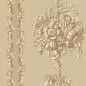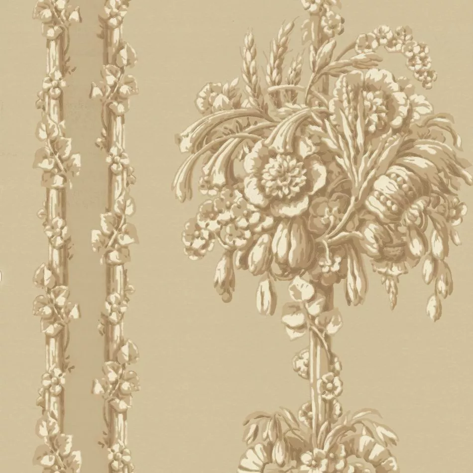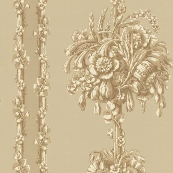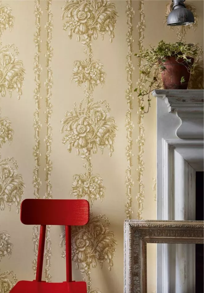 This pattern is unmistakably French in style, but the archive document, which has given the new design plenty of design options, comes from a prestigious address near the Thames. The decorative stripe on either side of the flower pillar has been retained but reduced to give the pattern more balance when applied repeatedly.