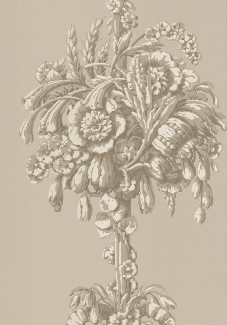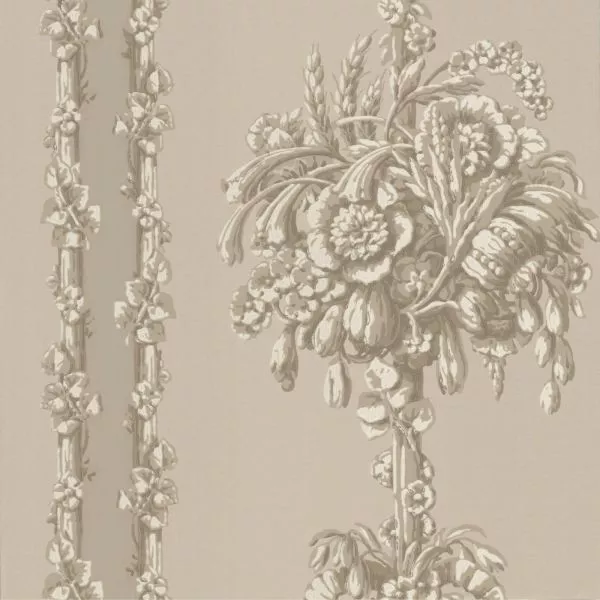 This pattern is unmistakably French in style, but the archive document, which has given the new design plenty of design options, comes from a prestigious address near the Thames. The decorative stripe on either side of the flower pillar has been retained but reduced to give the pattern more balance when applied repeatedly.