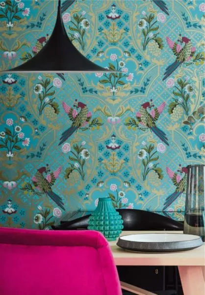 A lively and engaging design featuring striking birds and delicate floral motifs. Slightly raised and incorporating rich gilding detail, the pattern was originally designed to imitate stamped leather. Based on early 18th century French textiles and furnishings, encompassing panels, scrolls and cross hatching, this wallpaper was found at Brodsworth Hall in South Yorkshire. An elegant, Victorian home, it was built between 1861–1863, privately owned and inhabited until 1990, and has since been conserved by English Heritage. The paper was certainly a family favourite – unusually it was used in both the library and the morning room in reverse colourways, and can still been seen in situ today.