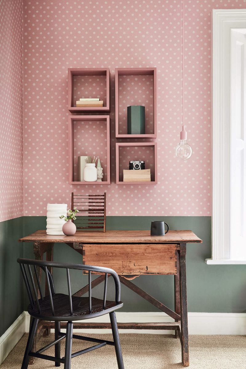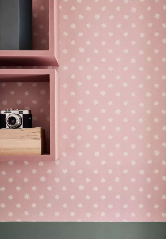 An abstract paper, which, despite its contemporary appearance, probably dates back to the early 1800s when such designs were hugely popular. The original colourway, featuring orangey stars on a pinky-yellow ground, was discovered on an upper floor of a commercial property that had been refaced in the early nineteenth century but was most probably a much older building.