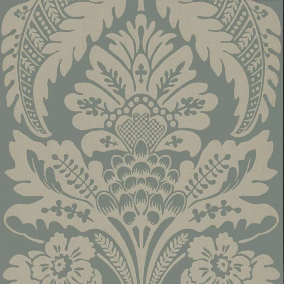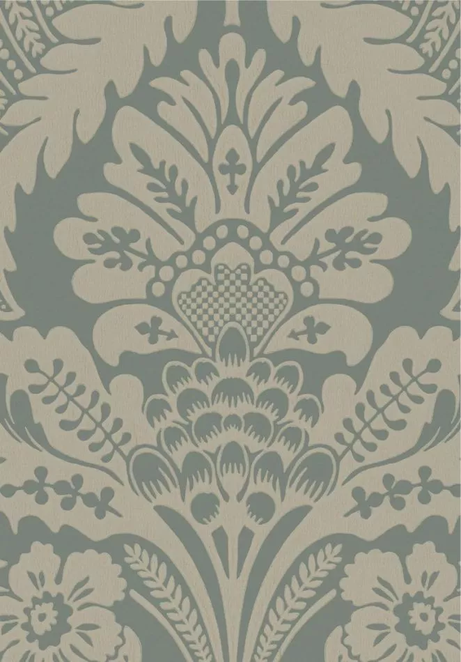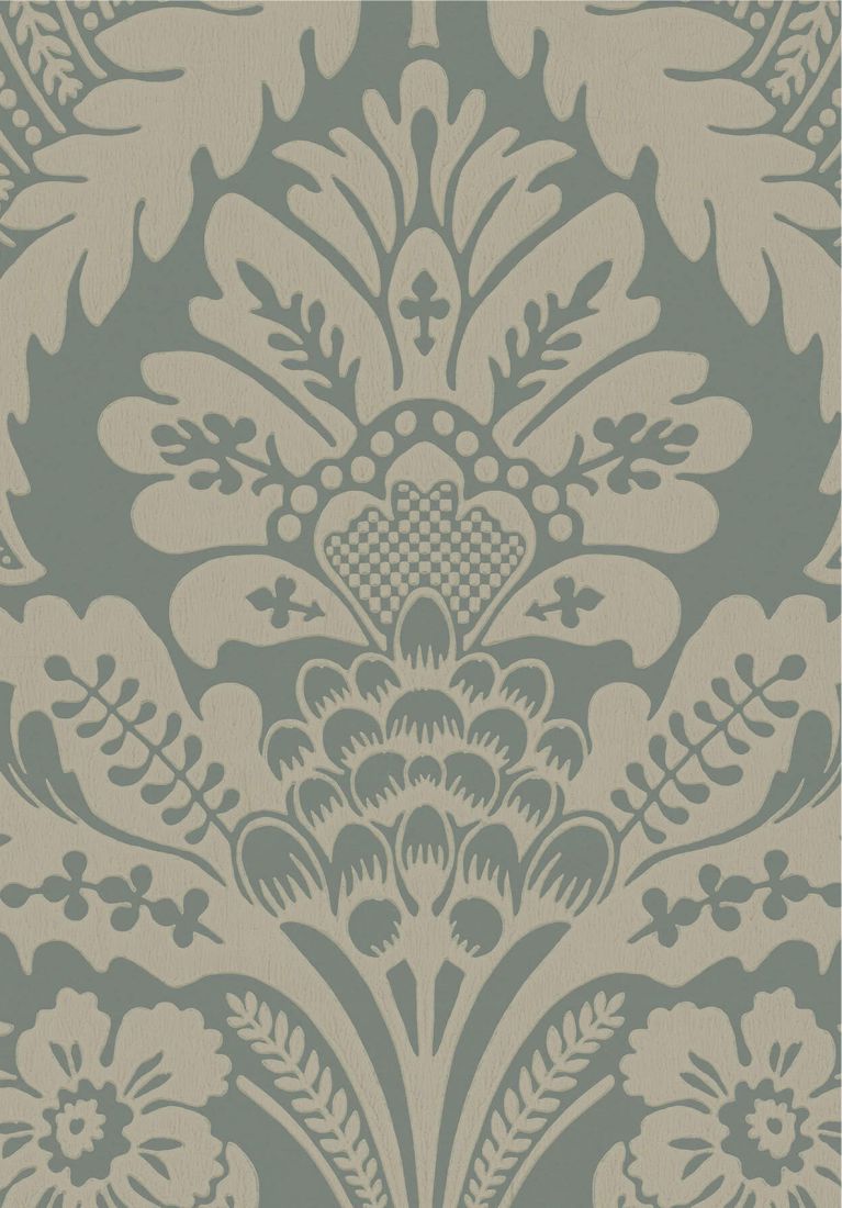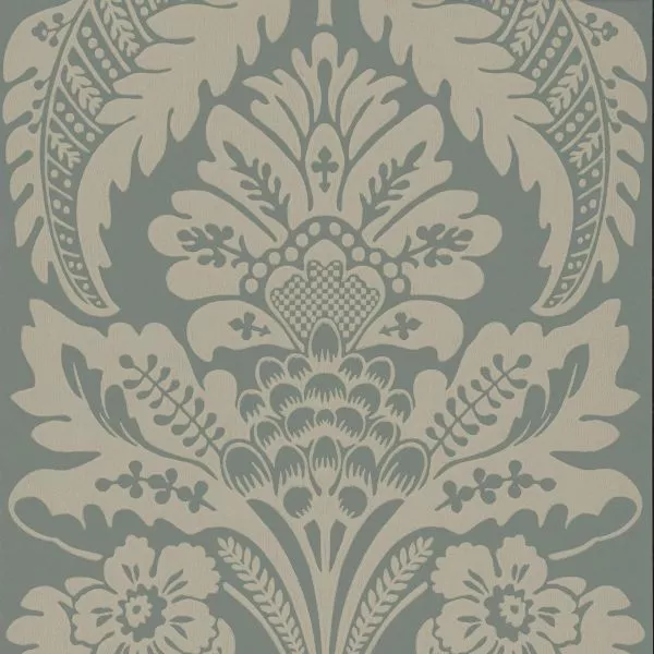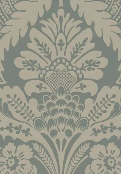 A classic damask design that is very typical of the popular large-scale pomegranate patterns of the mid-18th century, this would originally have been a flock wallpaper and hung in a grand English home. Flock papers were an English speciality and were really just imitations of expensive textiles, but nonetheless, they were expensive to produce and a bold statement of luxury and social status.