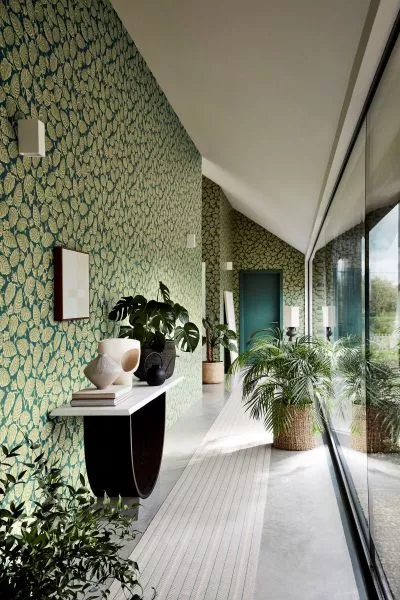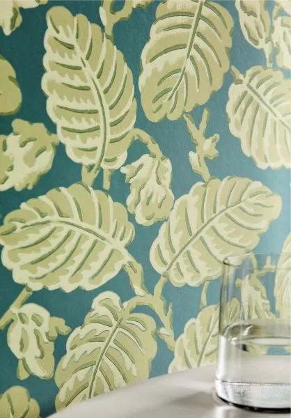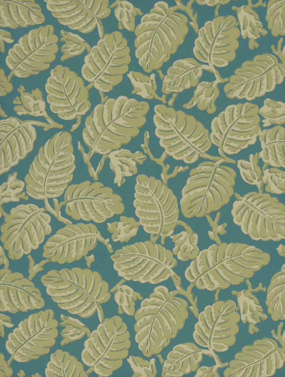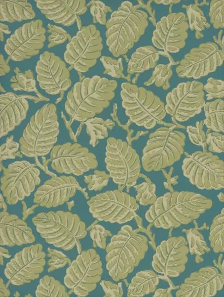 An authentic very late Georgian design discovered at Oxburgh Hall in Norfolk. Originally used in a colorful flocked floral border, the leaf and nut element was block printed in a more muted gray colourway. While significantly more colourful, the six contemporary interpretations all employ a similarly balanced color palette and the characteristic, artisanal texture of a surface-printed paper.