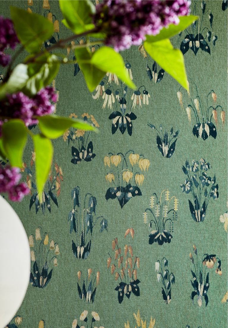 The floral details in this design are derived directly from an incredibly rare, important and lovingly preserved artefact, the oldest tapestry in the care of the National Trust. Located at Montacute House in Somerset, the 10m2 piece is woven from wool and silk and depicts a knight against a backdrop of hundreds of tiny flowers on a dark ground.