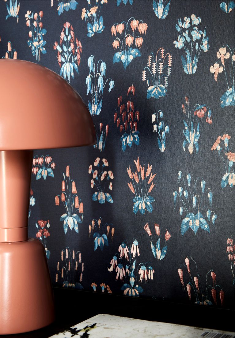The floral details in this design are derived directly from an incredibly rare, important and lovingly preserved artefact, the oldest tapestry in the care of the National Trust. Located at Montacute House in Somerset, the 10m2 piece is woven from wool and silk and depicts a knight against a backdrop of hundreds of tiny flowers on a dark ground.
