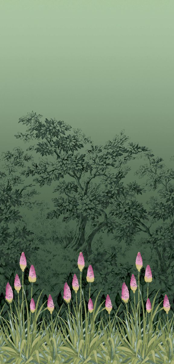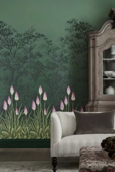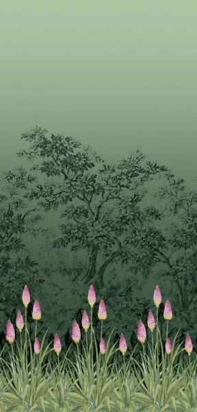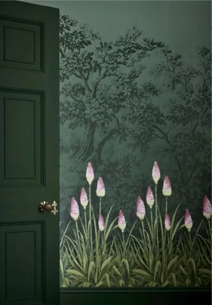 The design features brightly coloured kniphofia flowers, commonly known as torch lilies or red hot pokers (African in origin but named after German horticulturalist Johan Hieronymous Kniphof). They were recorded by English Heritage as having been hand-painted and stuck over a pre-hung wall covering in a late-18th century Upper Brook Street house as a bespoke decoration. To replicate a natural scene behind the pokers Little Greene has adapted a motif from its Stag Toile paper.