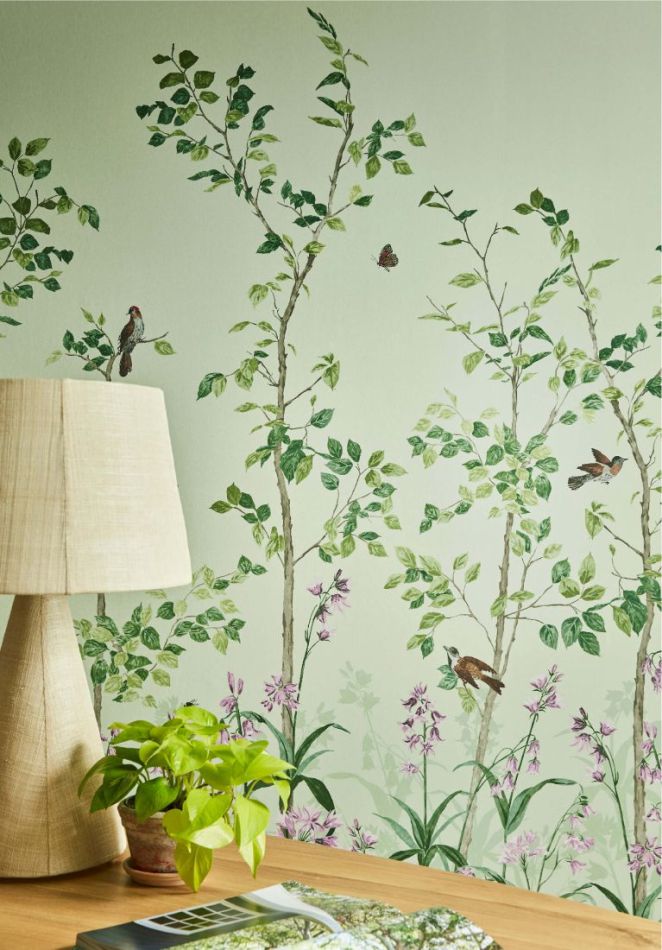 This elegant mural (156cm x 325cm) depicting birds, bees and bluebells was created from fragments of wallpaper found at Felbrigg Hall in Norfolk. Originally depicted on a striped background, the remaining source material has been adjusted, transformed and recolored to suit contemporary interiors. Available in four calm colors including soft green, pink and blue, as well as neutral tones.