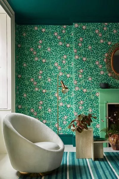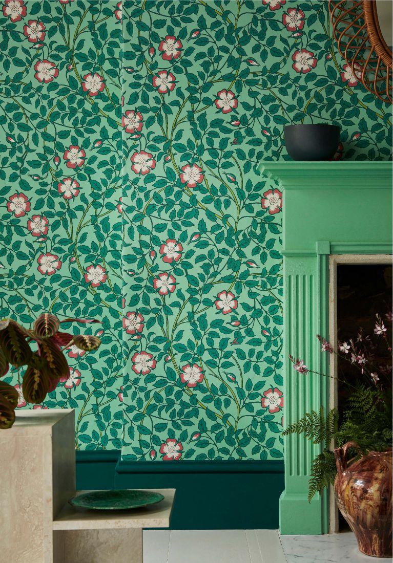 Originally designed by children's book illustrator Walter Crane, this wallpaper has an Arts and Crafts theme, evident in the densely stylized nature motifs. Many of Crane's drawings were picked up from children's room wallpaper. 'Briar Rose' was originally used as the background for a wallpaper titled 'Sleeping Beauty' which featured characters from the fairy tale Sleeping Beauty amongst the roses. The wallpaper was found at Oxburgh Hall and little is known about where in the house it was used, as much of the original now exists only in loose pattern pieces. The wallpaper was originally produced by the London company Jeffrey & Co. and is now available in the LITTLE GREENE collection in three soft combinations and three bright colours.