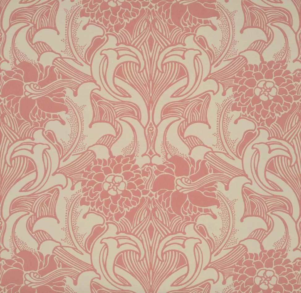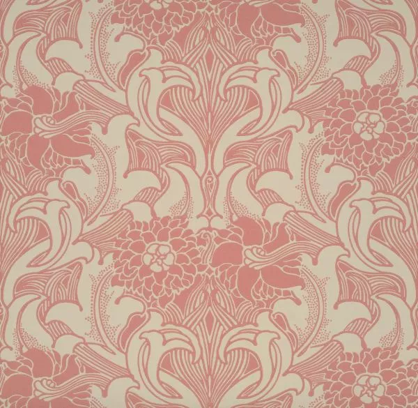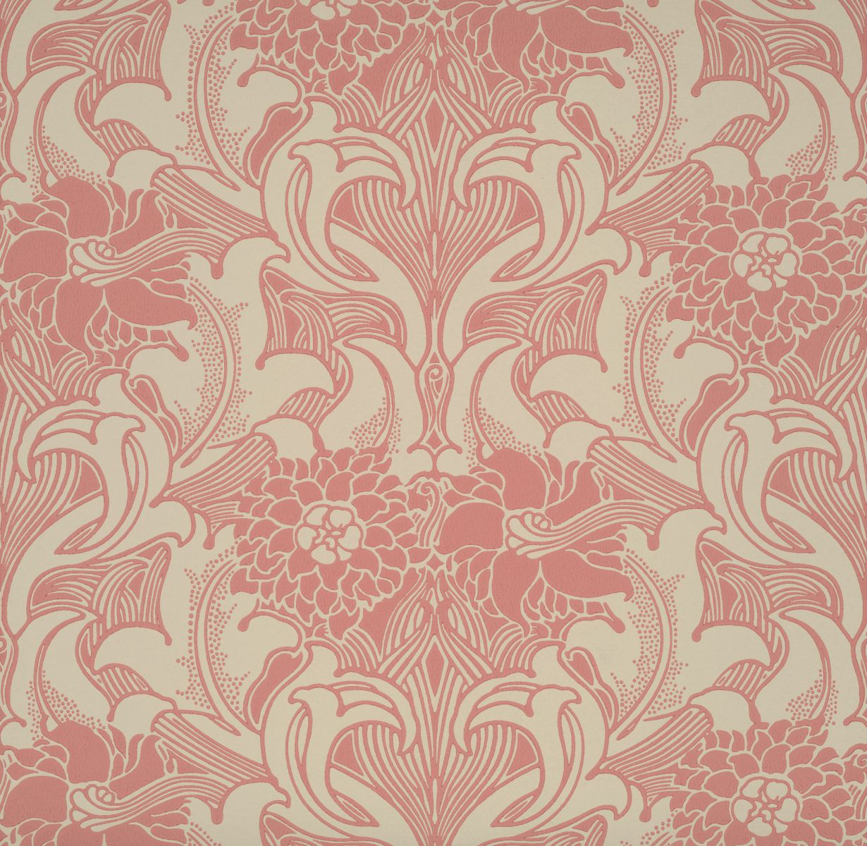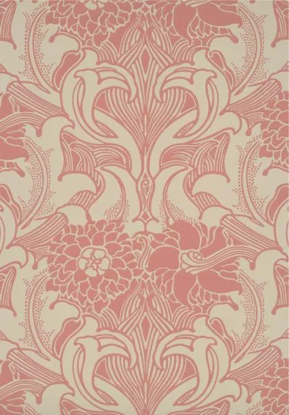A floral tendril design reminiscent of Voysey's early work. This two-tone wallpaper features an enlarged dahlia, a motif often found in Japanese designs, while the plant's sinuous forms, emanating from a single flower, are also characteristic of Art Nouveau.