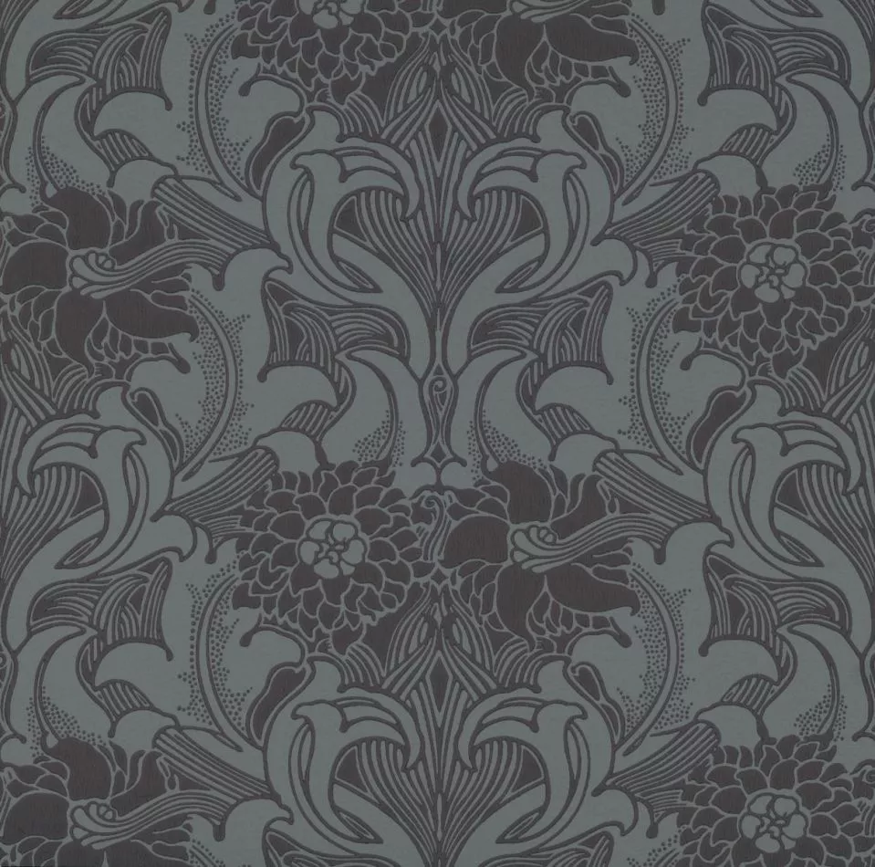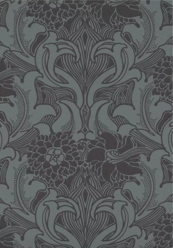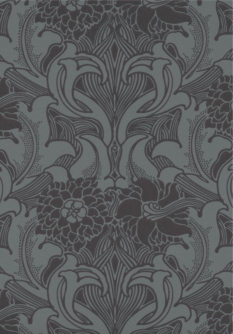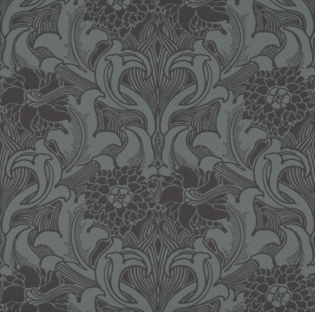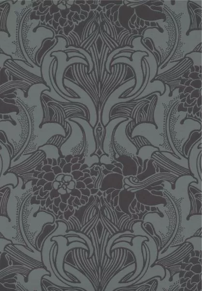 A floral tendril design reminiscent of Voysey's early work. This two-tone wallpaper features an enlarged dahlia, a motif often found in Japanese designs, while the plant's sinuous forms, emanating from a single flower, are also characteristic of Art Nouveau.
