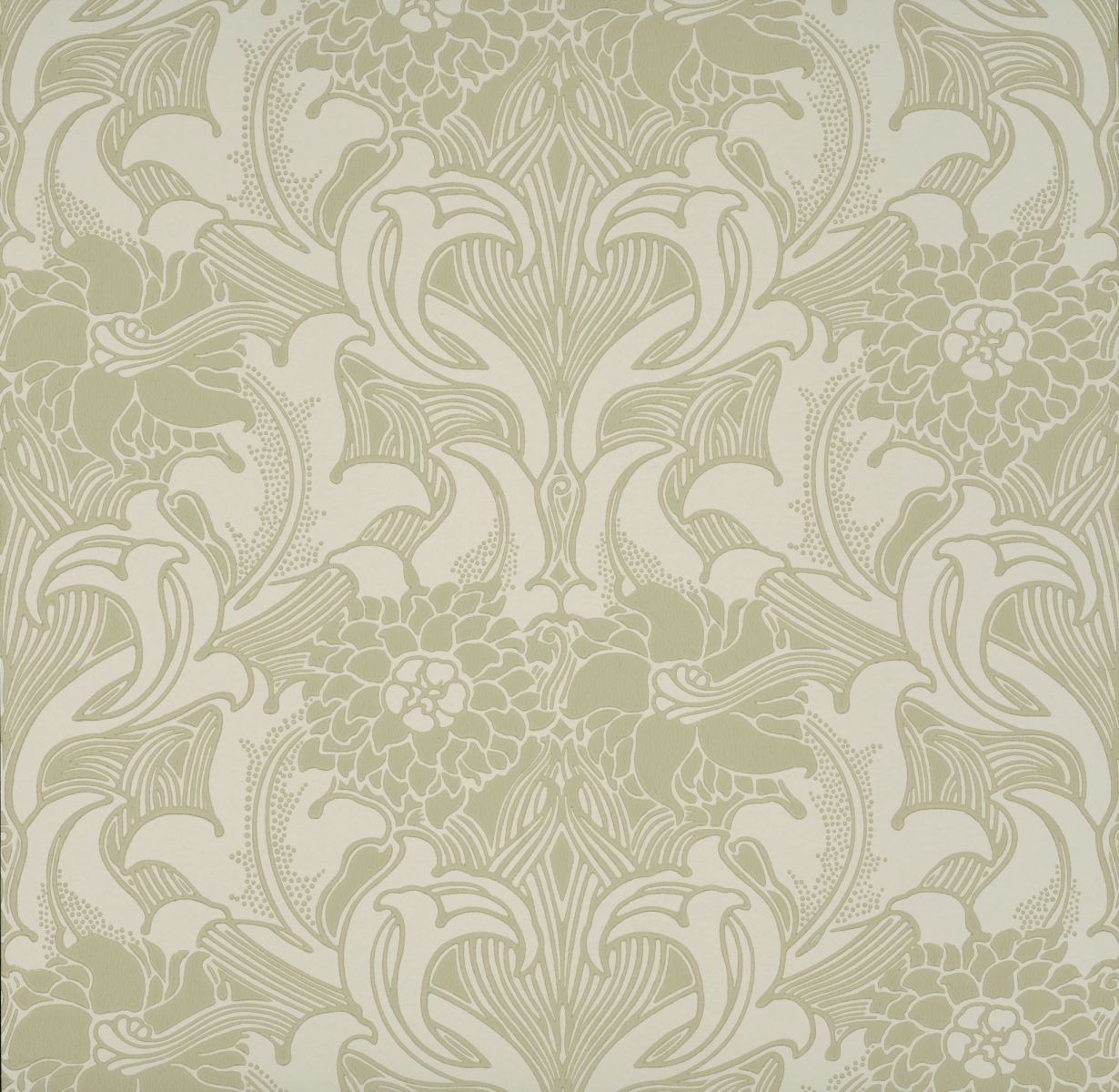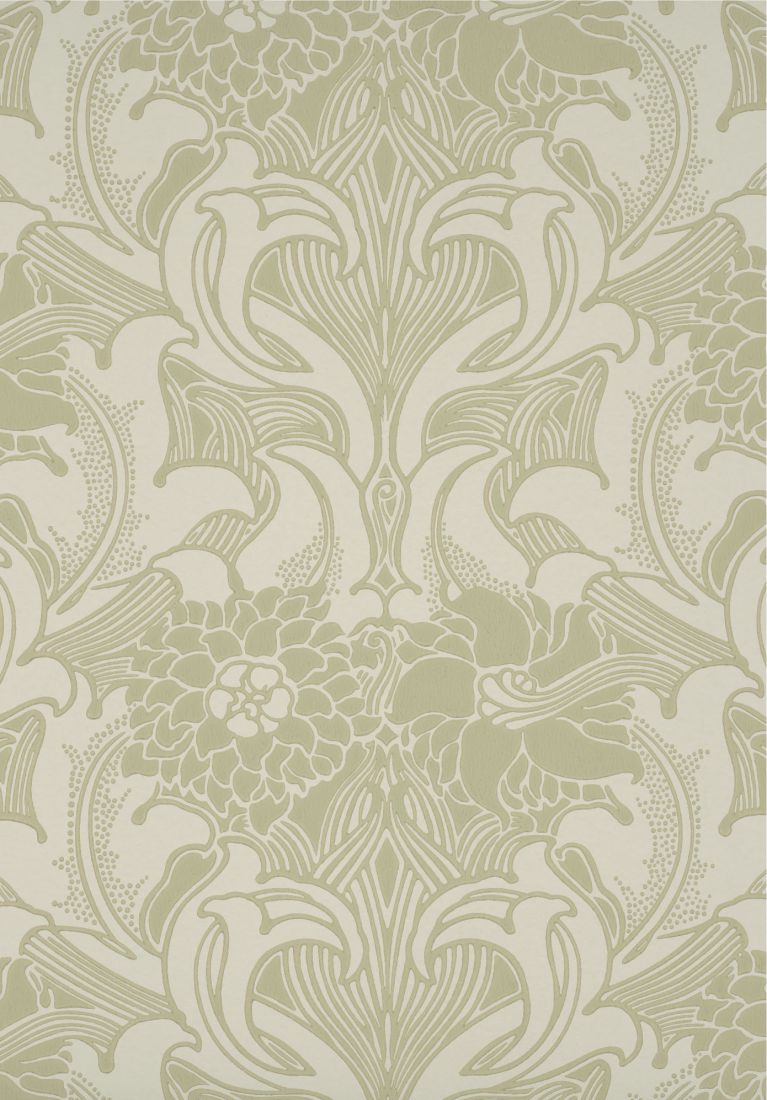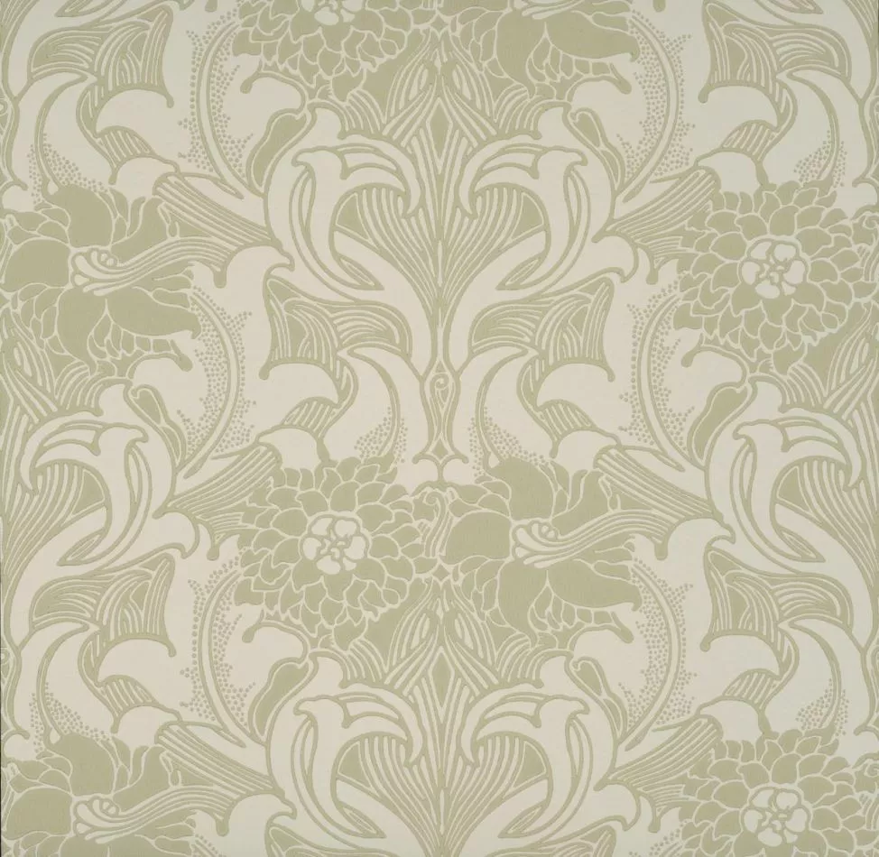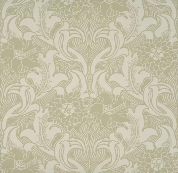 A floral tendril design reminiscent of Voysey's early work. This two-tone wallpaper features an enlarged dahlia, a motif often found in Japanese designs, while the plant's sinuous forms, emanating from a single flower, are also characteristic of Art Nouveau.