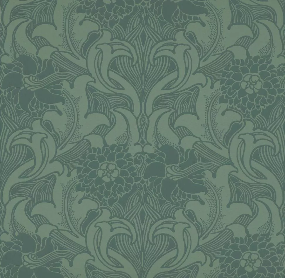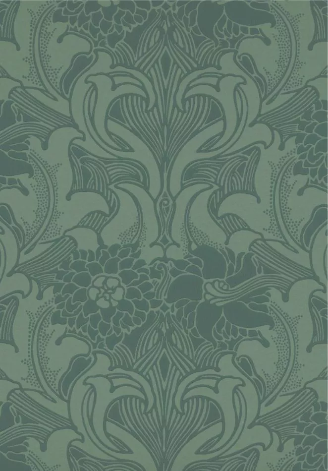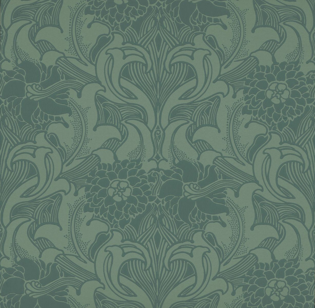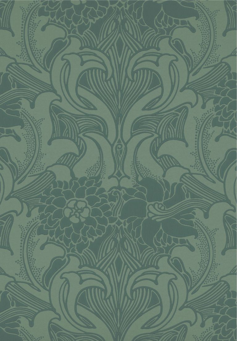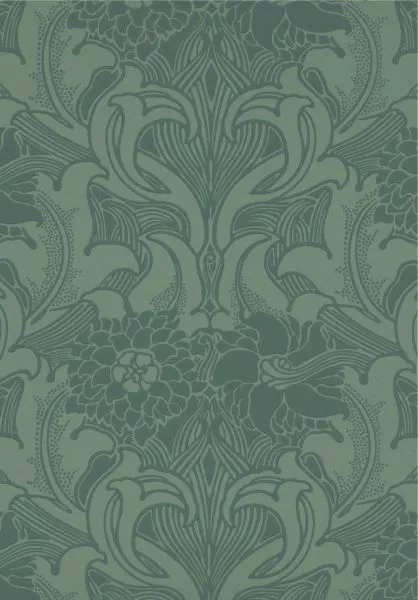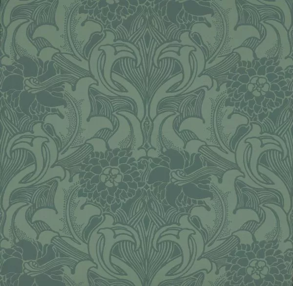 A floral tendril design reminiscent of Voysey's early work. This two-tone wallpaper features an enlarged dahlia, a motif often found in Japanese designs, while the plant's sinuous forms, emanating from a single flower, are also characteristic of Art Nouveau.