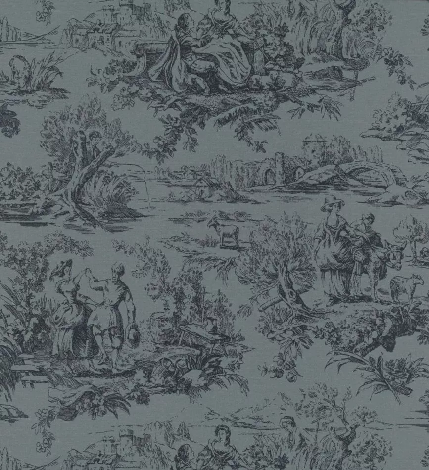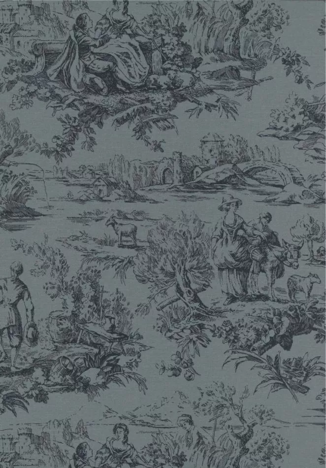 This contemporary take on a classic pattern is a reinterpretation of a post-WWII French "Toile-de-Jouy" design. Featuring vignettes of people engaged in a variety of activities such as fishing, dancing and gardening, this monochromatic design has been printed in five modern colourways. Matching the color drenching, two of the color schemes offer the same color in different nuances.