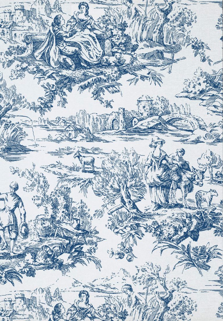 This contemporary take on a classic pattern is a reinterpretation of a post-WWII French "Toile-de-Jouy" design. Featuring vignettes of people engaged in a variety of activities such as fishing, dancing and gardening, this monochromatic design has been printed in five modern colourways. Matching the color drenching, two of the color schemes offer the same color in different nuances.