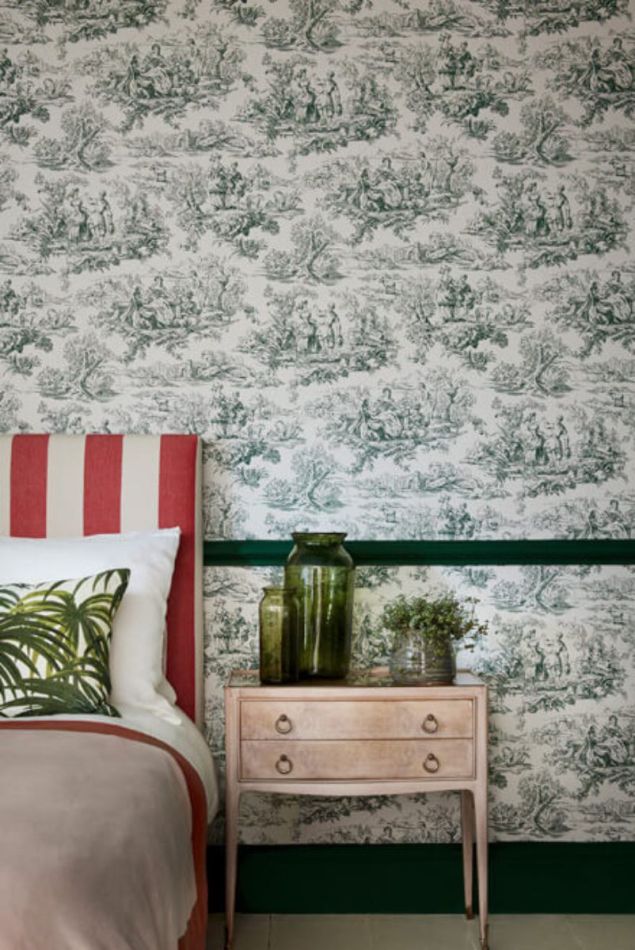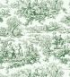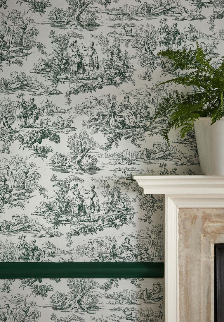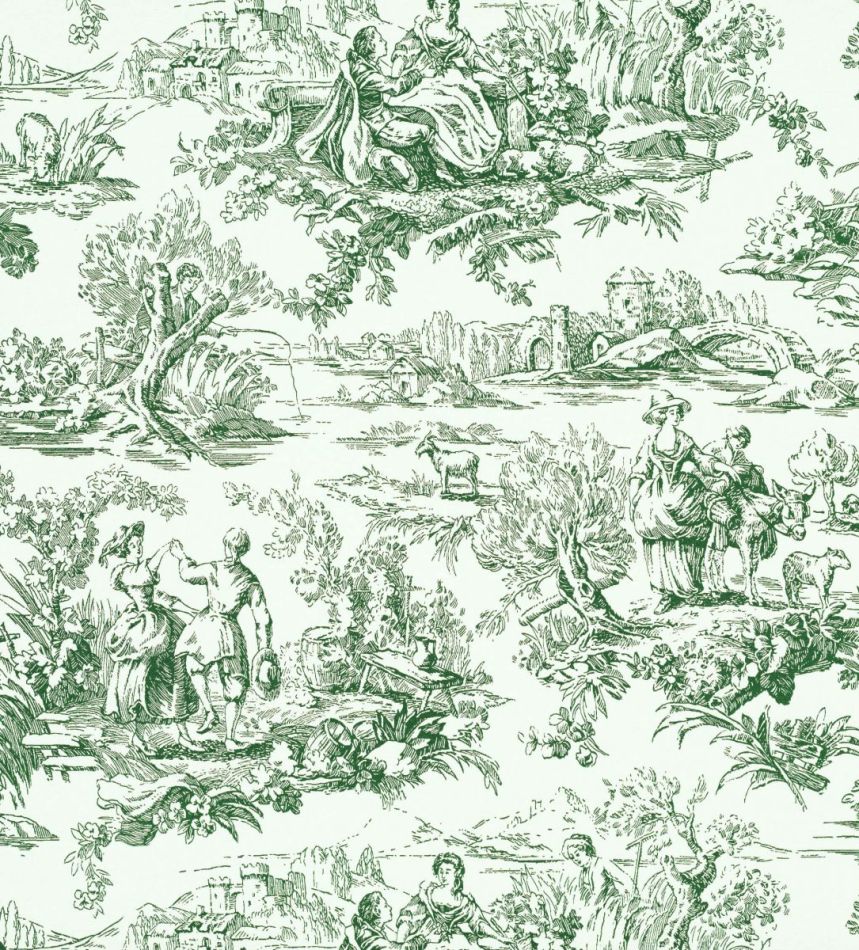 This contemporary take on a classic pattern is a reinterpretation of a post-WWII French "Toile-de-Jouy" design. Featuring vignettes of people engaged in a variety of activities such as fishing, dancing and gardening, this monochromatic design has been printed in five modern colourways. Matching the color drenching, two of the color schemes offer the same color in different nuances.