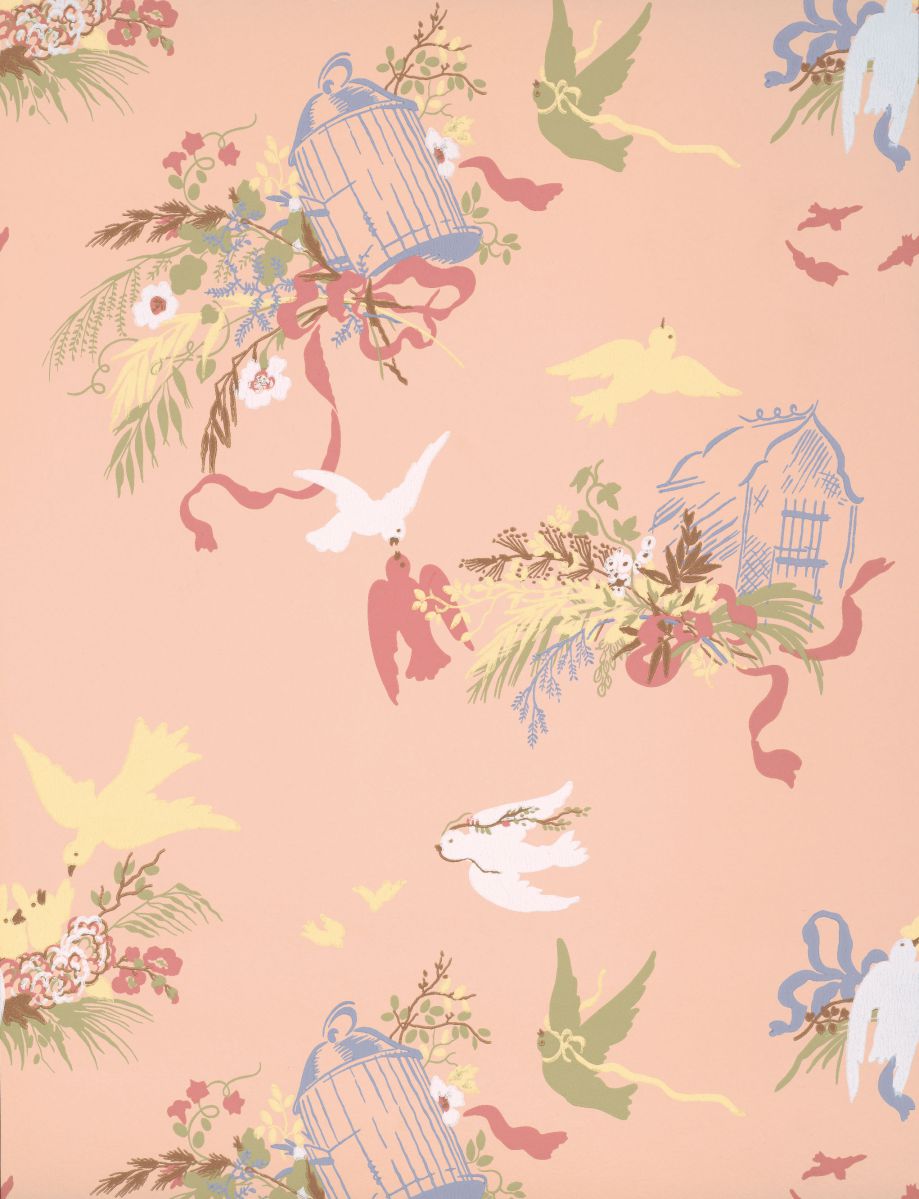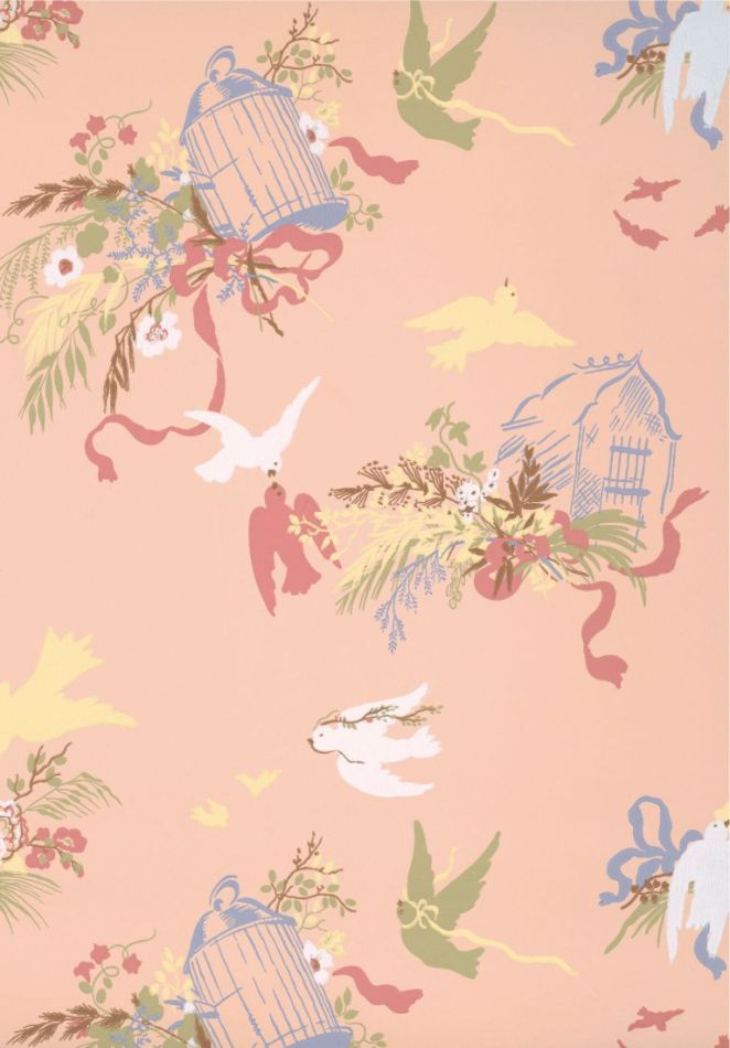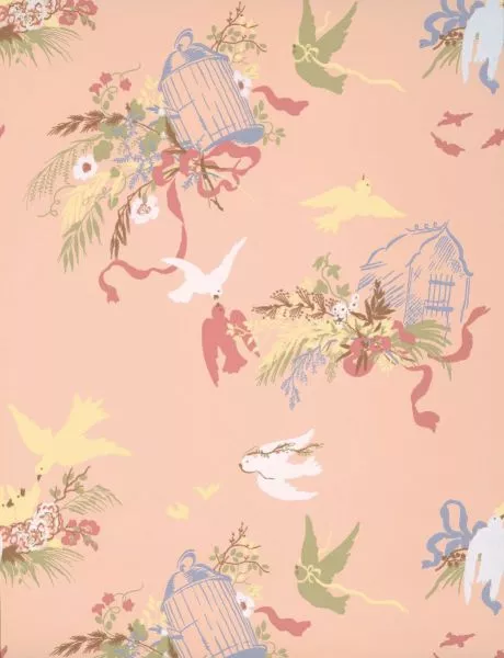 Featuring doves, ribbons and flowers inspired by the 1950s, this more contemporary wallpaper is a reinterpretation of 18th-century design. An archive photo found at Oxburgh Hall shows that this wallpaper was in one of the bedrooms of the family's private quarters. It is believed that the wallpaper was a visible reminder of the last days of Oxburgh's family ownership, as it was put up for sale just months after the wallpaper was made. The soft pink original has been reproduced in the shades of LITTLE GREENE alongside four other contemporary colourways.