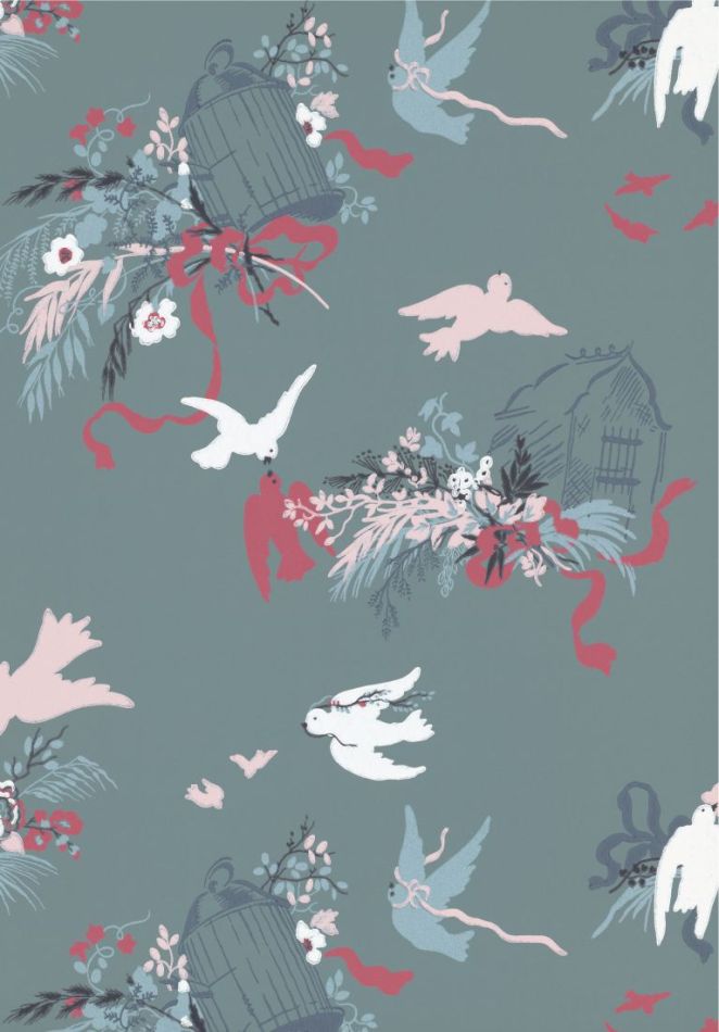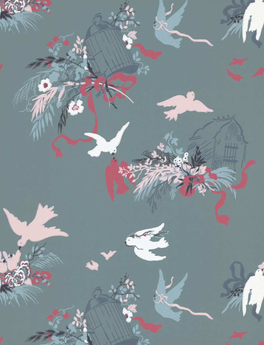 Featuring doves, ribbons and flowers inspired by the 1950s, this more contemporary wallpaper is a reinterpretation of 18th-century design. An archive photo found at Oxburgh Hall shows that this wallpaper was in one of the bedrooms of the family's private quarters. It is believed that the wallpaper was a visible reminder of the last days of Oxburgh's family ownership, as it was put up for sale just months after the wallpaper was made. The soft pink original has been reproduced in the shades of LITTLE GREENE alongside four other contemporary colourways.