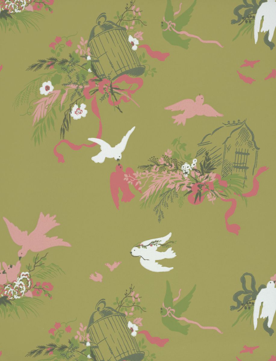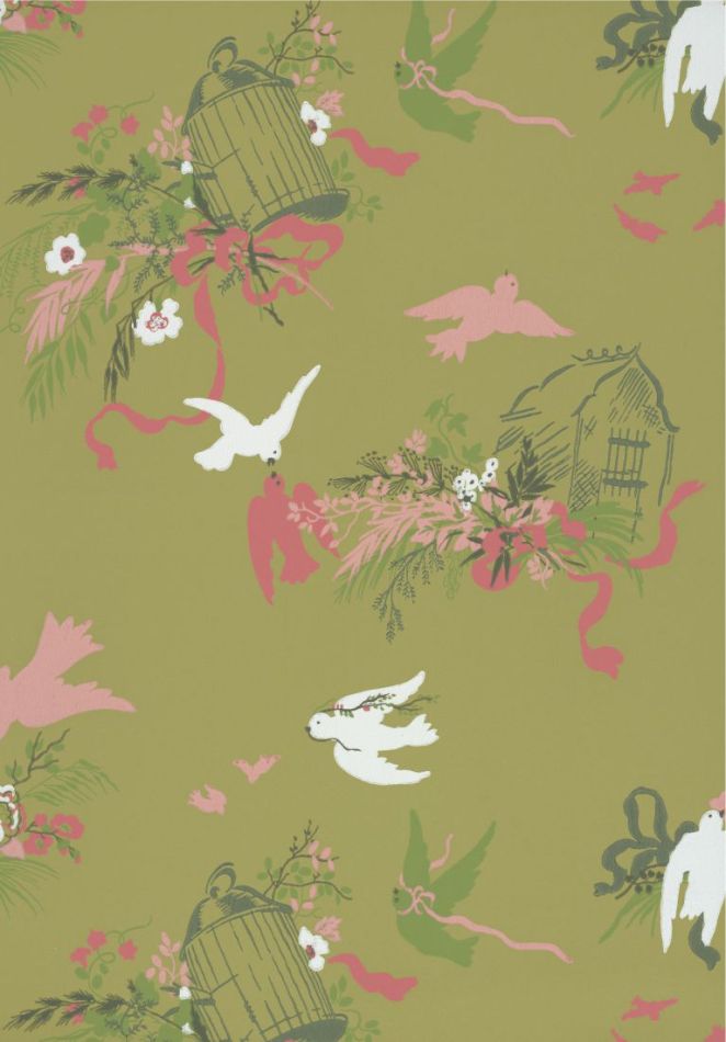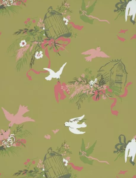 Featuring doves, ribbons and flowers inspired by the 1950s, this more contemporary wallpaper is a reinterpretation of 18th-century design. An archive photo found at Oxburgh Hall shows that this wallpaper was in one of the bedrooms of the family's private quarters. It is believed that the wallpaper was a visible reminder of the last days of Oxburgh's family ownership, as it was put up for sale just months after the wallpaper was made. The soft pink original has been reproduced in the shades of LITTLE GREENE alongside four other contemporary colourways.