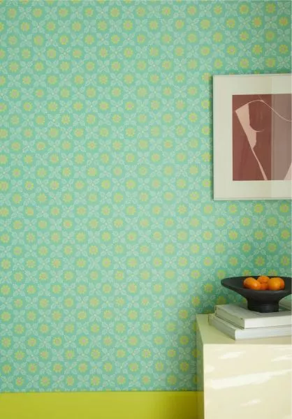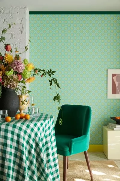 This charming floral wallpaper was discovered at Felbrigg Hall in Norfolk and is one of the most intriguing wallpapers on the estate. Its discovery location is curious, as the wallpaper was found in an attic, likely a former servant's room—a peculiar place to hang an ornate wallpaper. The wallpaper was probably produced using the woodblock printing technique, and the original features a painted braiding at the top of the pattern, reminiscent of damask furniture. This pattern, available in six contemporary colors, was manufactured using surface printing to authentically replicate the original production method.