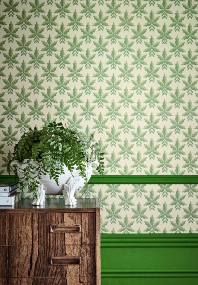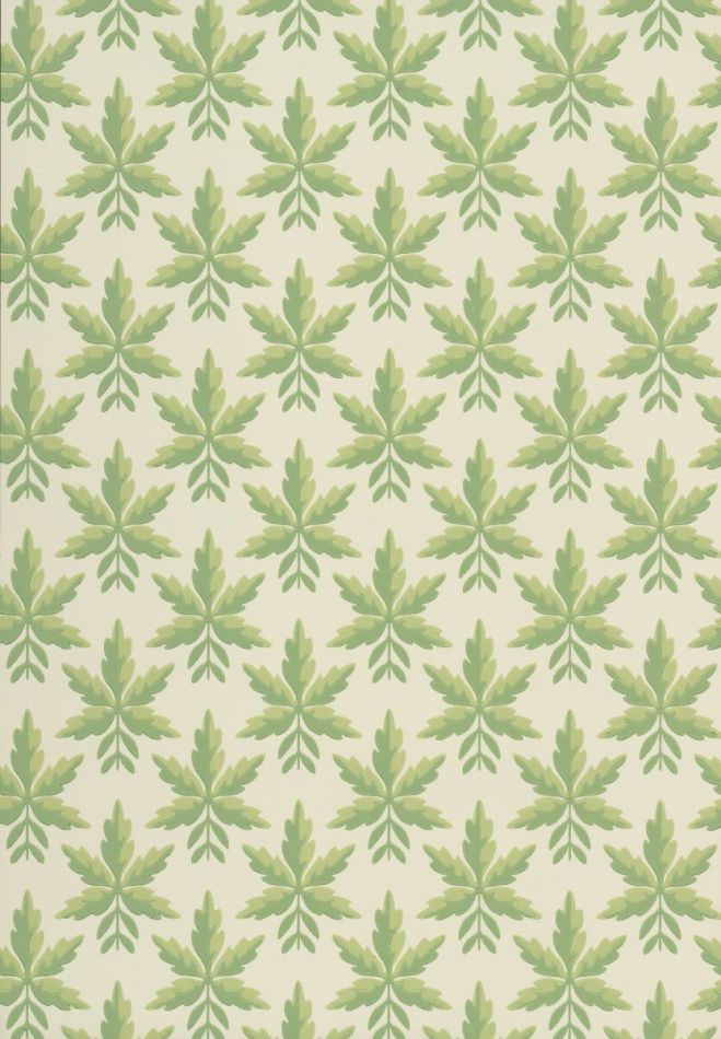 Built by a courtier of Henry VIII in the Cotswolds, Newark Park is a Tudor style hunting lodge; unfortunately only a fragment of this design with small leaves survives. The simple pattern featured two shades of green on a satin white background, creating the illusion of a woven fabric; interestingly, it was adapted from a wallpaper from the clock tower of Hampton Court Palace. The design took its name from James Clutterbuck, who acquired Newark Park in the mid-18th century, although the wallpaper dates to the early 19th century. Five contemporary colourways encompass softer contrasts and bolder primary shades on matte white that mirror the impact of the original design.
