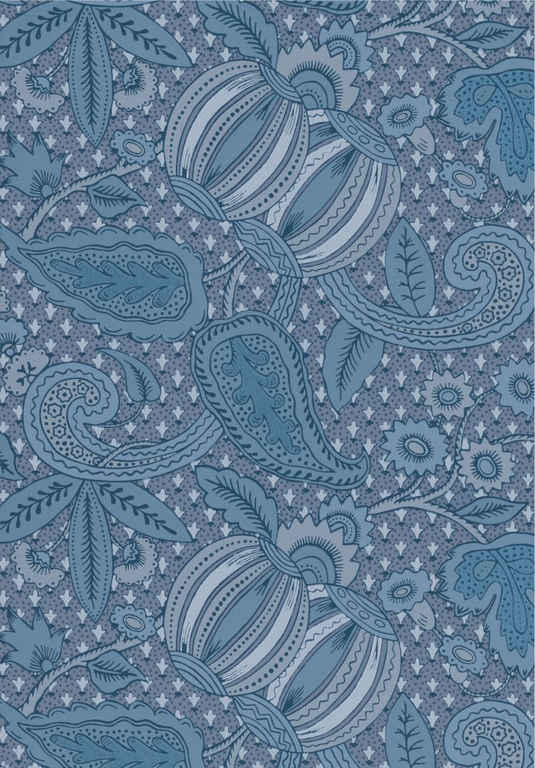 This Baroque design is a rare and very early find, discovered by the National Trust among tapestries at Erddig Hall in Wales. It was printed in blocks onto handmade paper webs that were nailed (rather than glued) directly to the wall; when they were removed, the oldest verified tax stamp was found on the back. The colorful yellow original has been streamlined into four colorways. Three other colors ensure that this cheerful paisley design can also be used in a variety of modern interiors.
