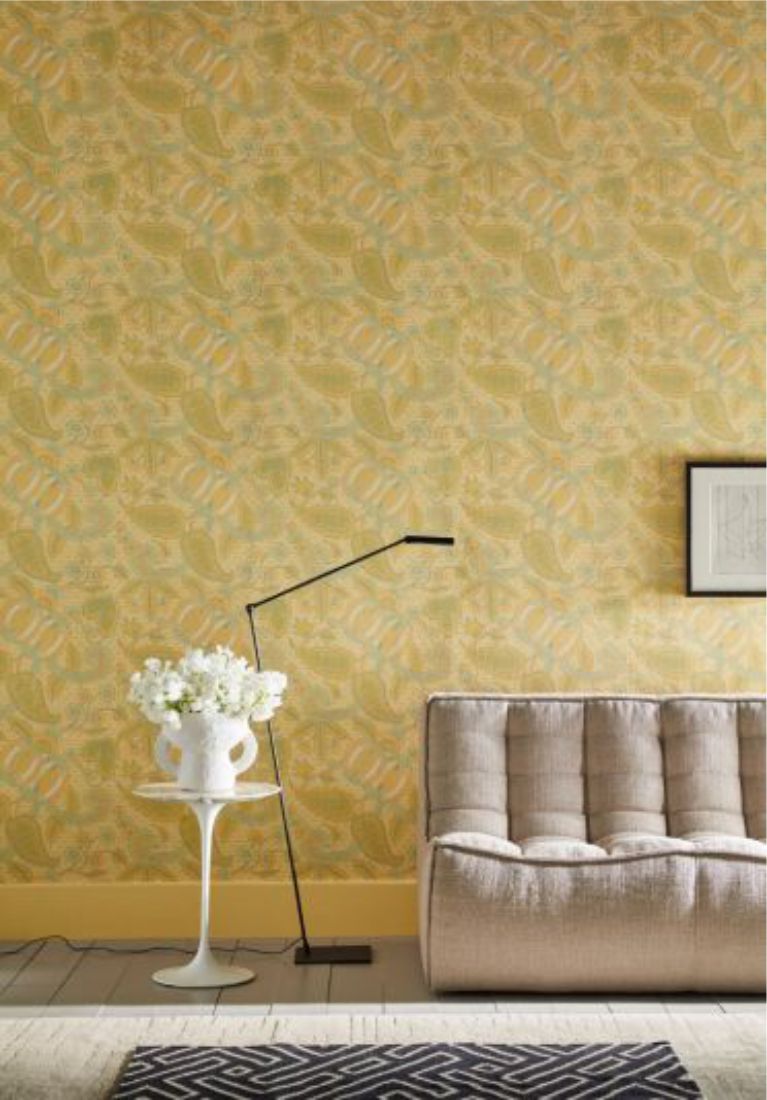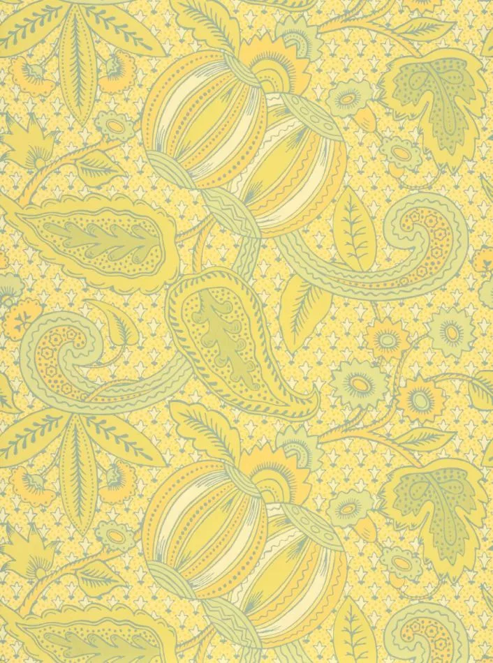 This Baroque design is a rare and very early find, discovered by the National Trust among tapestries at Erddig Hall in Wales. It was printed in blocks onto handmade paper webs that were nailed (rather than glued) directly to the wall; when they were removed, the oldest verified tax stamp was found on the back. The colorful yellow original has been streamlined into four colorways. Three other colors ensure that this cheerful paisley design can also be used in a variety of modern interiors.