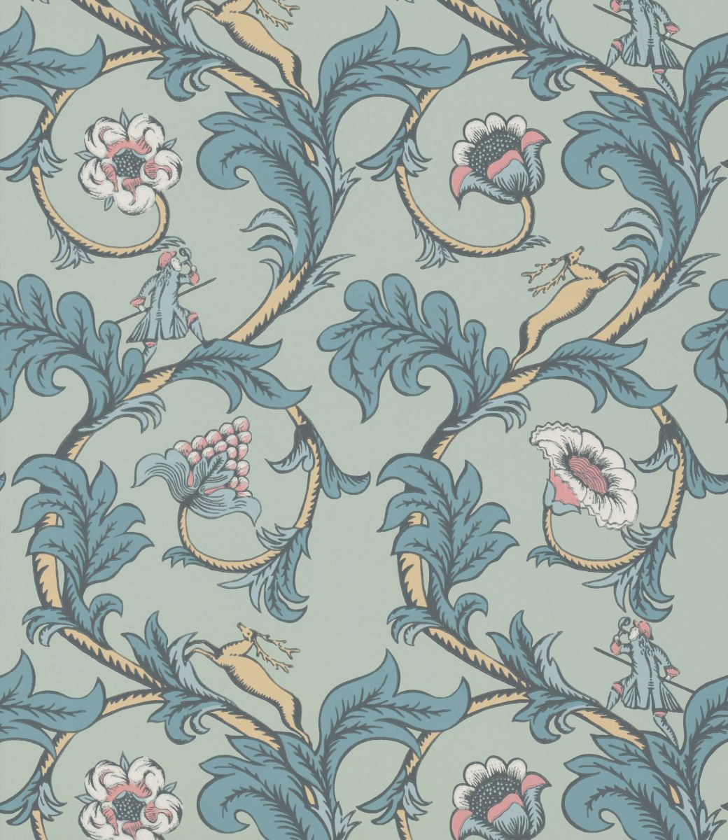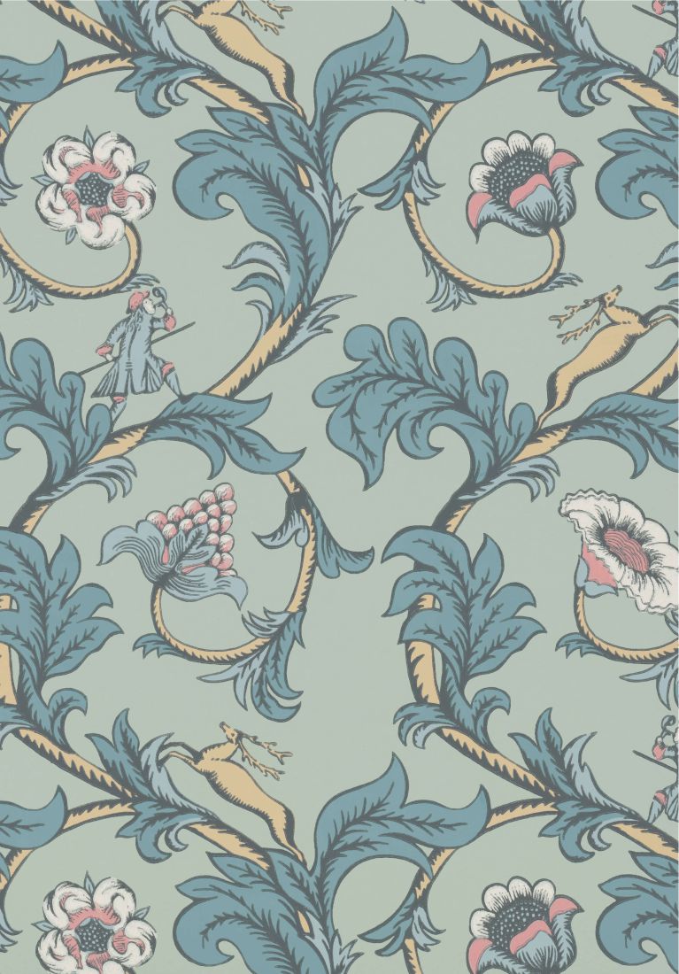 This classic Georgian design can be admired at Greyfriars, a medieval wooden house in Worcester. Elsie Moore, a 20th-century owner of the property, acquired some unused scrolls from a parish in nearby Pershore and displayed clippings from them as framed panels in her pale yellow dining room. Suspecting that the turquoise pigment in the background might contain arsenic, she wrapped the panels in plain wrapping paper to avoid accidentally poisoning herself and her guests. The holes from the nails she used are still visible today, but thankfully - and risk-free - the wallpaper is now being presented again. The original wallpaper has been scaled down for ease of use, while the four colorways include a nod to the original, a traditional interpretation, as well as more modern options.