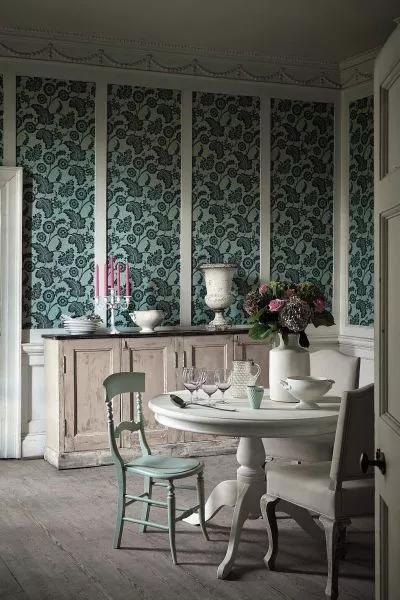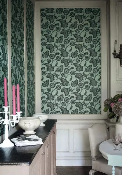 Piccadilly c. 1790 Less is known about this wallpaper than its comparable partner Soho Square (see London Wallpapers), but the resemblance is obvious. The archival document of this sample is a fake flock wallpaper, meaning it was designed to look like a more expensive flock wallpaper, but in fact the effect was created by the print and not the texture.