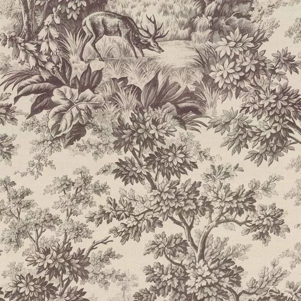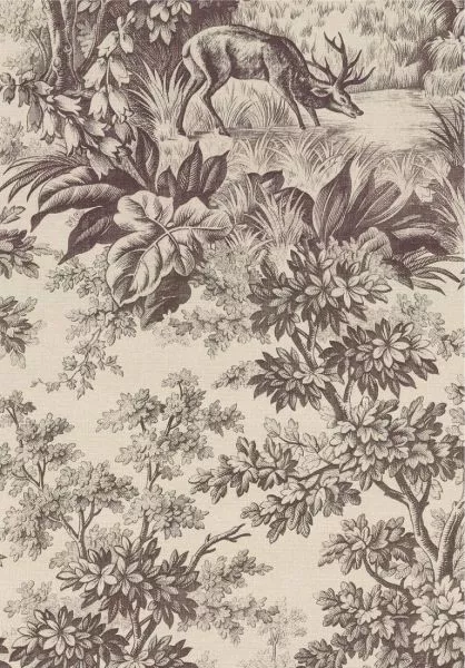 This 19th-century monochrome print of a forest with stag on English linen is considerably less formal than the typical 'Toile de Jouy' designs that emerged in France in the late 18th century.