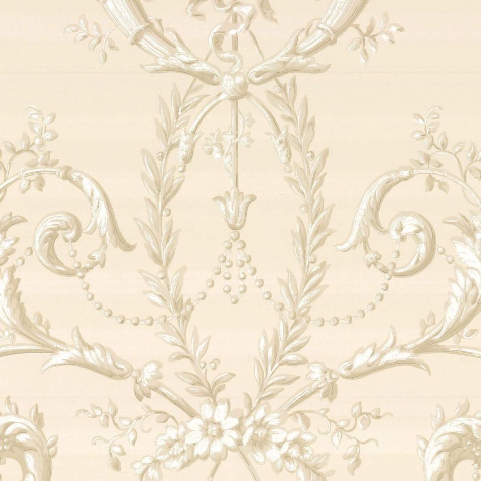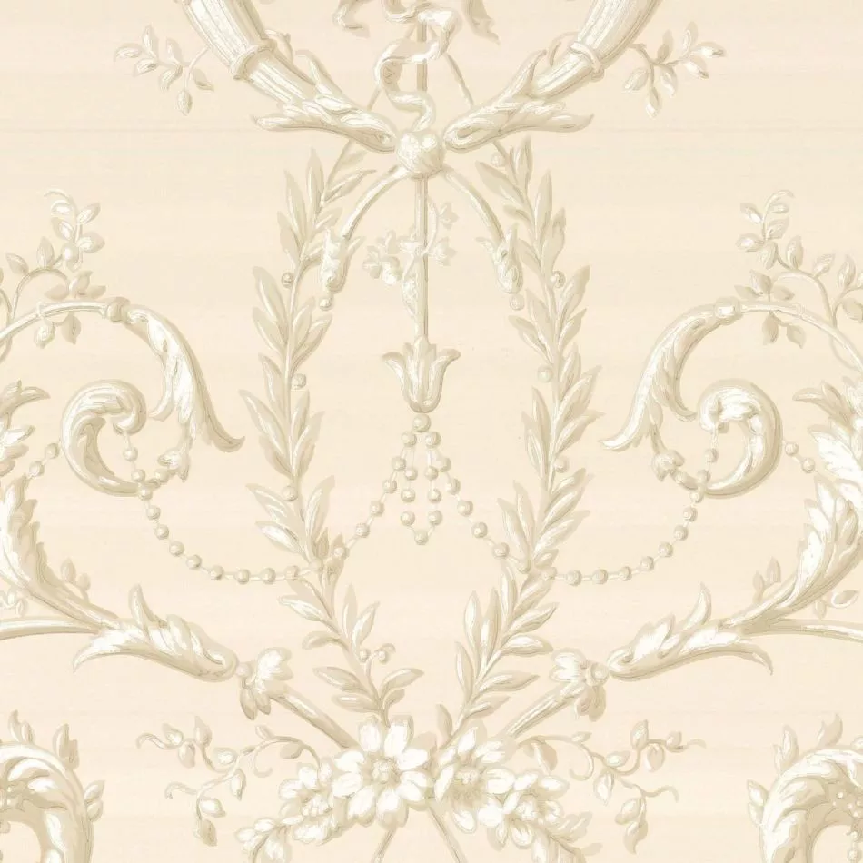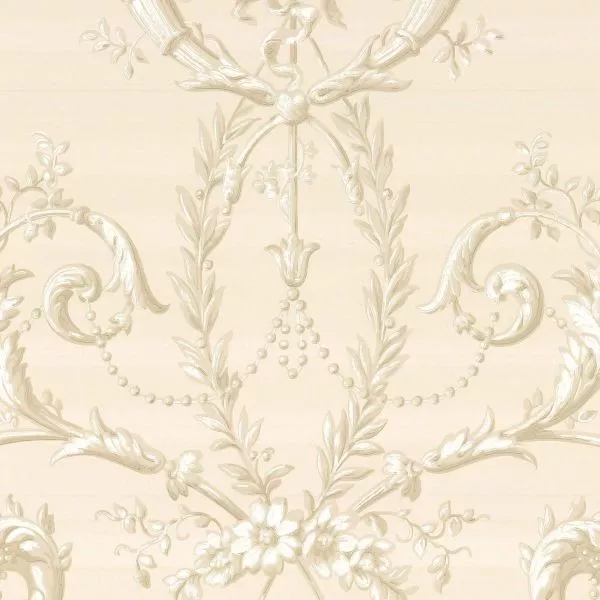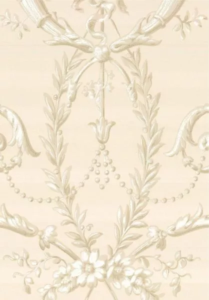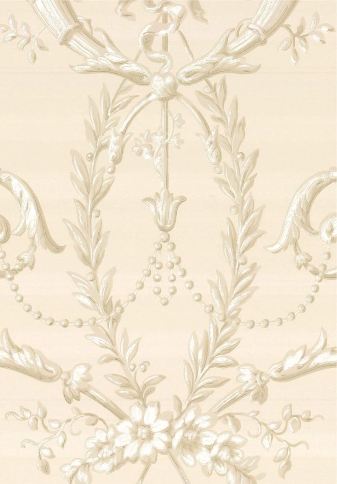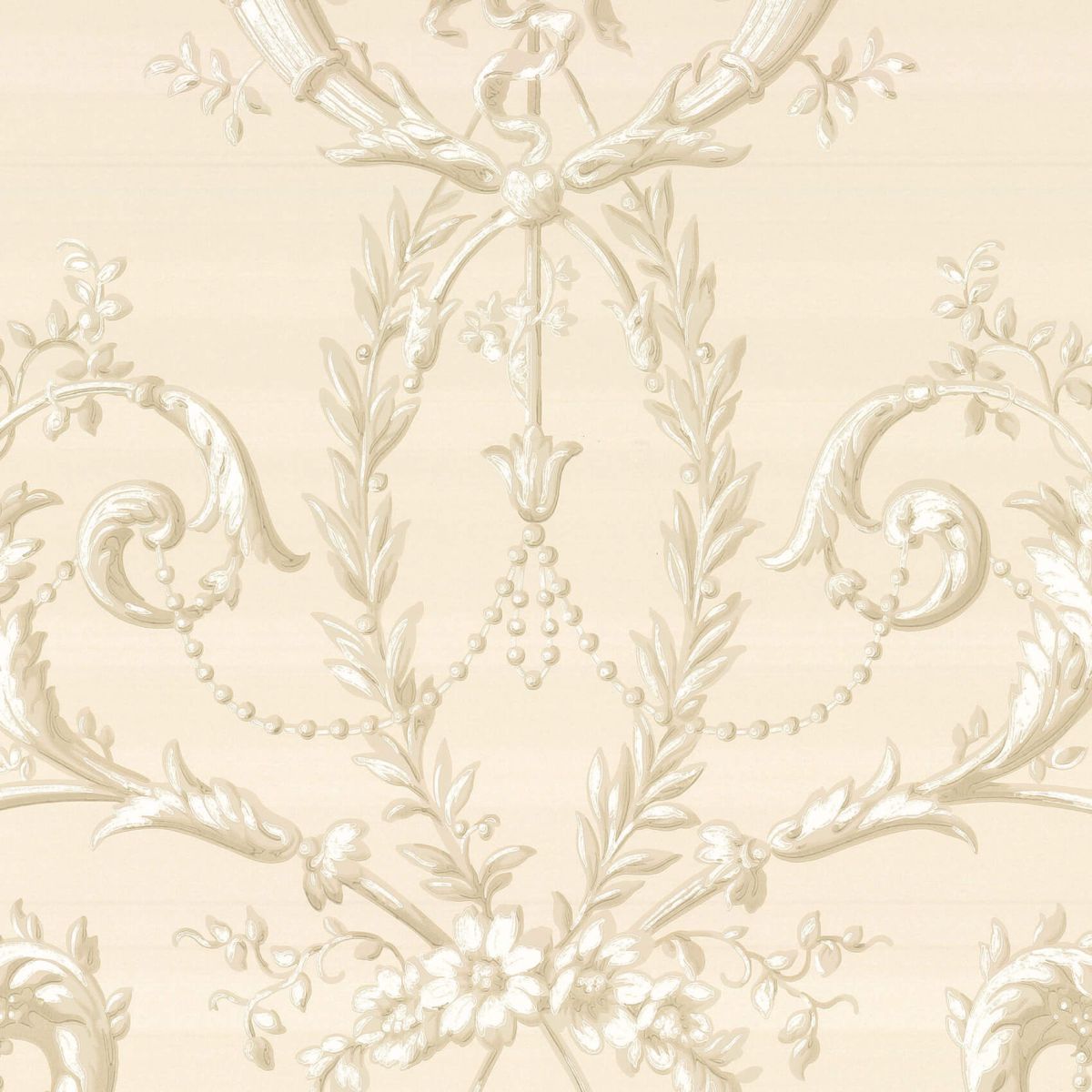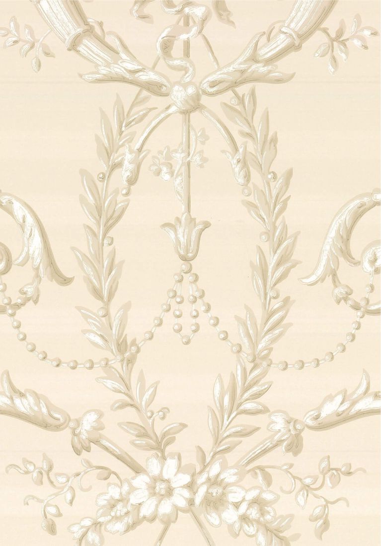 Versailles c. 1890 is a wallpaper that came into being a little later than its traditional design would suggest. It is based on an original document that has been machine printed with gradations of color to give it a trompe-l'oeil effect. In the classic rococo style, it features flourishes and an abundance of flowers.