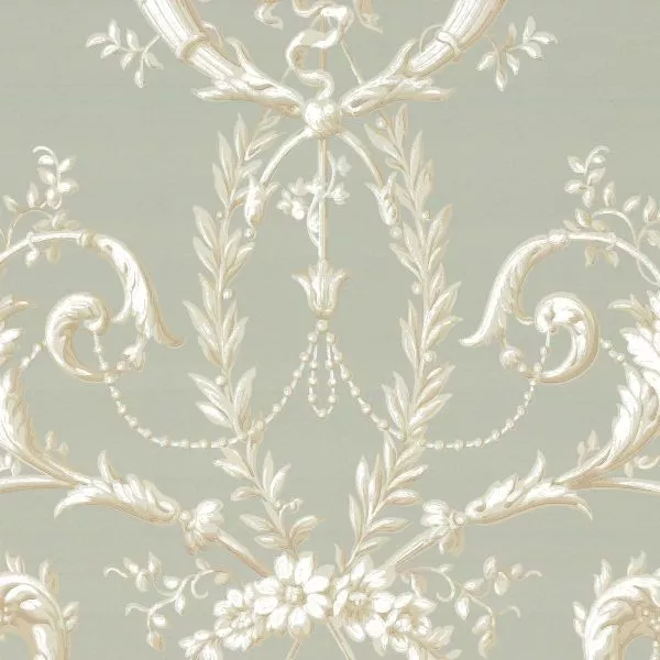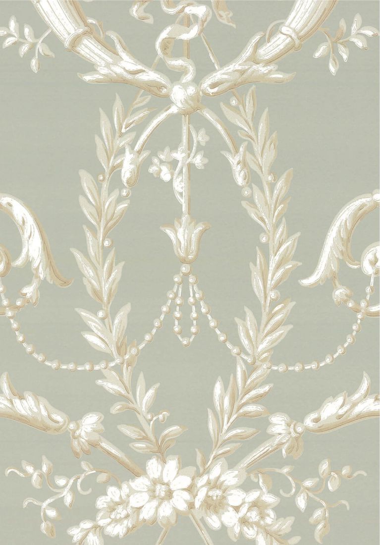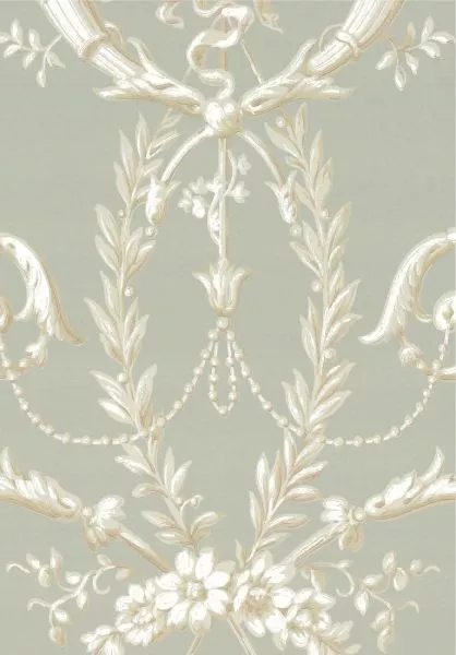 Versailles c. 1890 is a wallpaper that came into being a little later than its traditional design would suggest. It is based on an original document that has been machine printed with gradations of color to give it a trompe-l'oeil effect. In the classic rococo style, it features flourishes and an abundance of flowers.