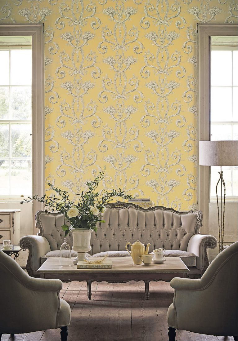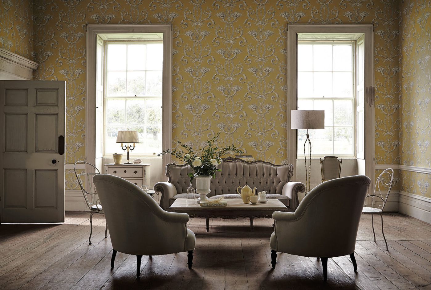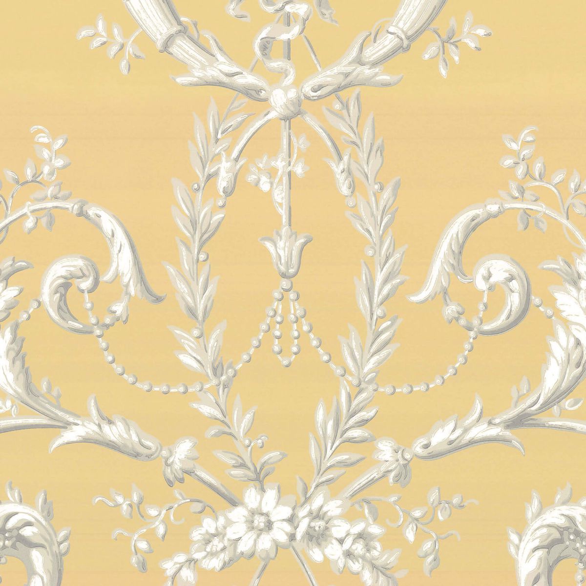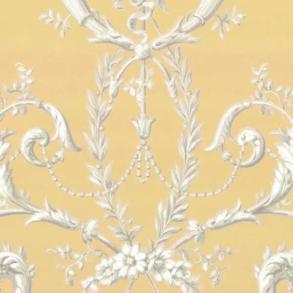Versailles c. 1890 is a wallpaper that came into being a little later than its traditional design would suggest. It is based on an original document that has been machine printed with gradations of color to give it a trompe-l'oeil effect. In the classic rococo style, it features flourishes and an abundance of flowers.