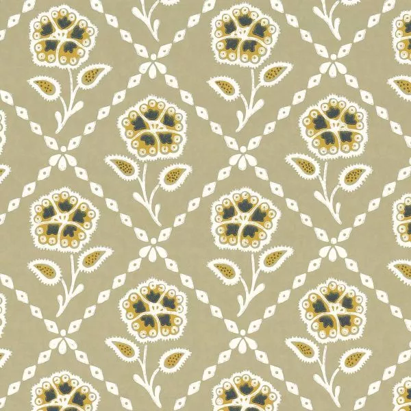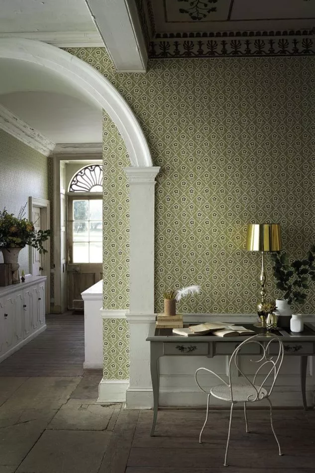 This wallpaper, which clearly shows French influences, was found in Surrey in a medieval building that was once a school. The floral lattice pattern was undoubtedly inspired by textile designs, as linen and cotton flannel printed in this way became very popular in the mid-18th century.