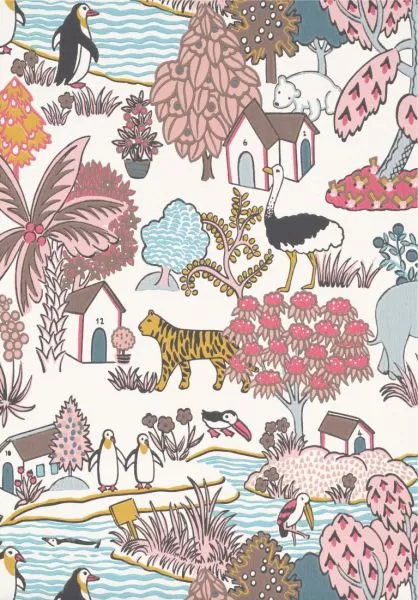 The pattern was made into slip covers for furniture in the children’s nursery. Featuring a polar bear and penguins alongside an elephant and an ostrich, the playful design is rich in imagination and has translated effortlessly into a surface-printed wallpaper pattern in a range of confident colourways.