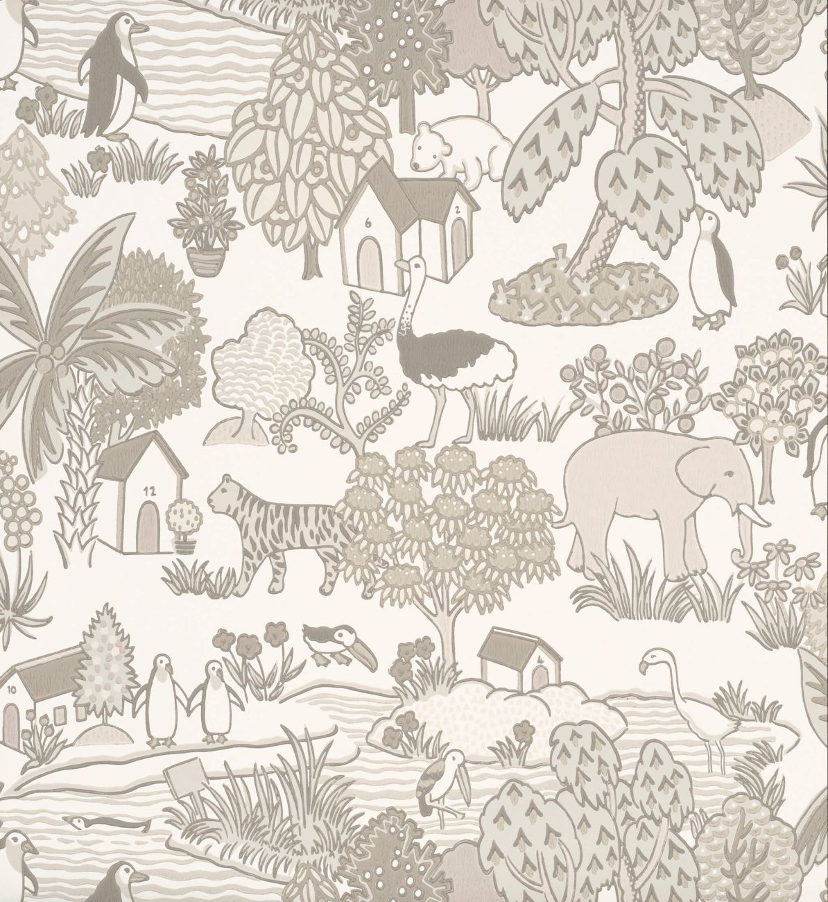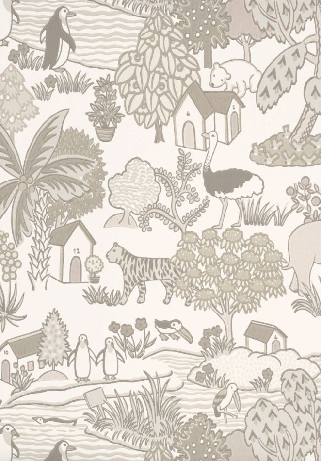 The pattern was made into slip covers for furniture in the children’s nursery. Featuring a polar bear and penguins alongside an elephant and an ostrich, the playful design is rich in imagination and has translated effortlessly into a surface-printed wallpaper pattern in a range of confident colourways.
