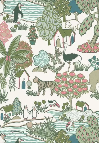 The pattern was made into slip covers for furniture in the children’s nursery. Featuring a polar bear and penguins alongside an elephant and an ostrich, the playful design is rich in imagination and has translated effortlessly into a surface-printed wallpaper pattern in a range of confident colourways.