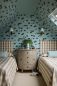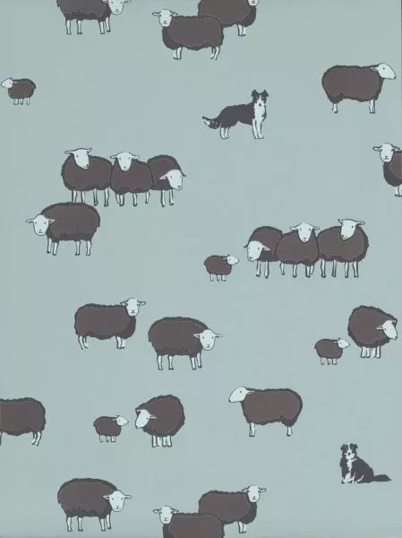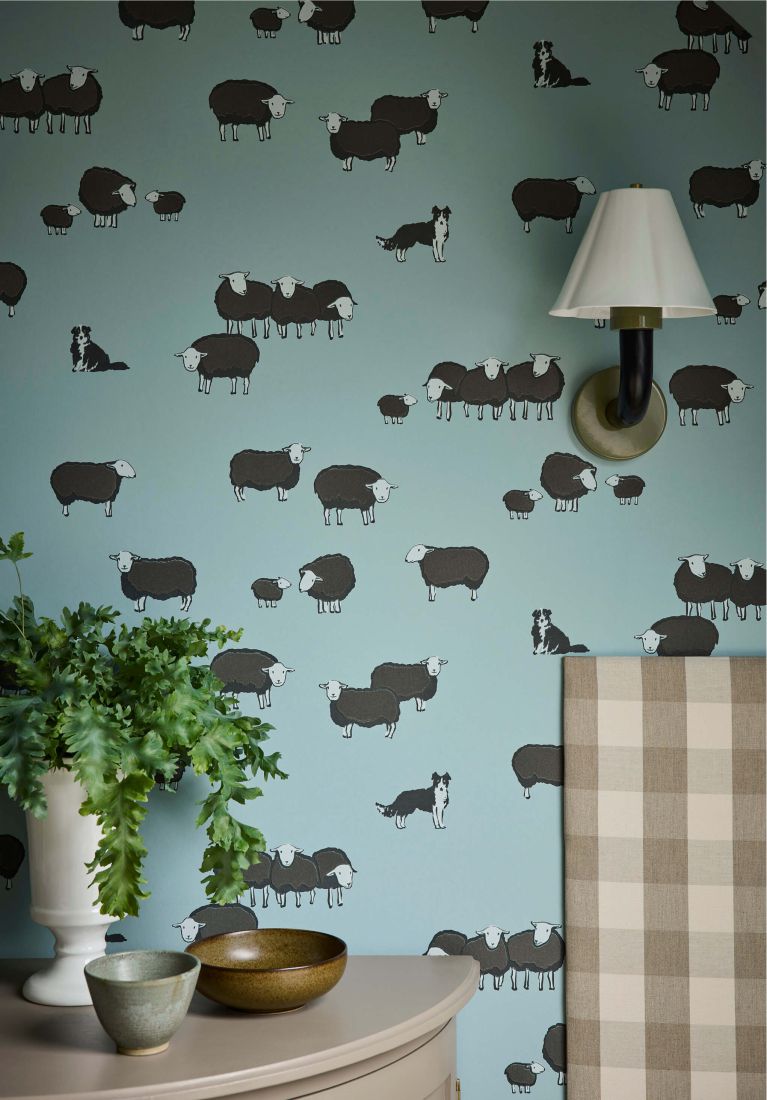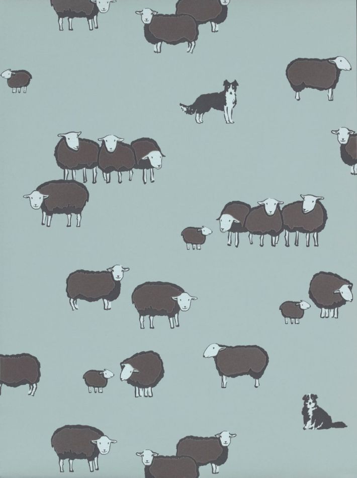 The dogs in this design are Beatrix Potter’s doodled portraits of her beloved working collies, Nip and Lassie. The original sketches are tiny but effortlessly translate into a light-hearted wallpaper design, in which the accompanying sheep have been flocked to bring extra surface texture.