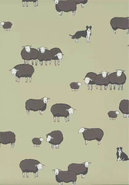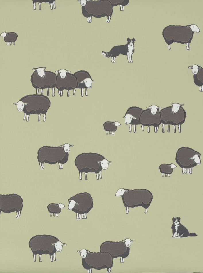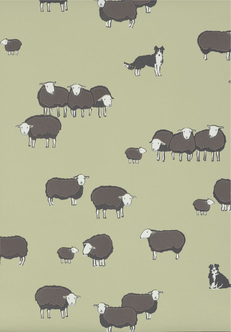 The dogs in this design are Beatrix Potter’s doodled portraits of her beloved working collies, Nip and Lassie. The original sketches are tiny but effortlessly translate into a light-hearted wallpaper design, in which the accompanying sheep have been flocked to bring extra surface texture.